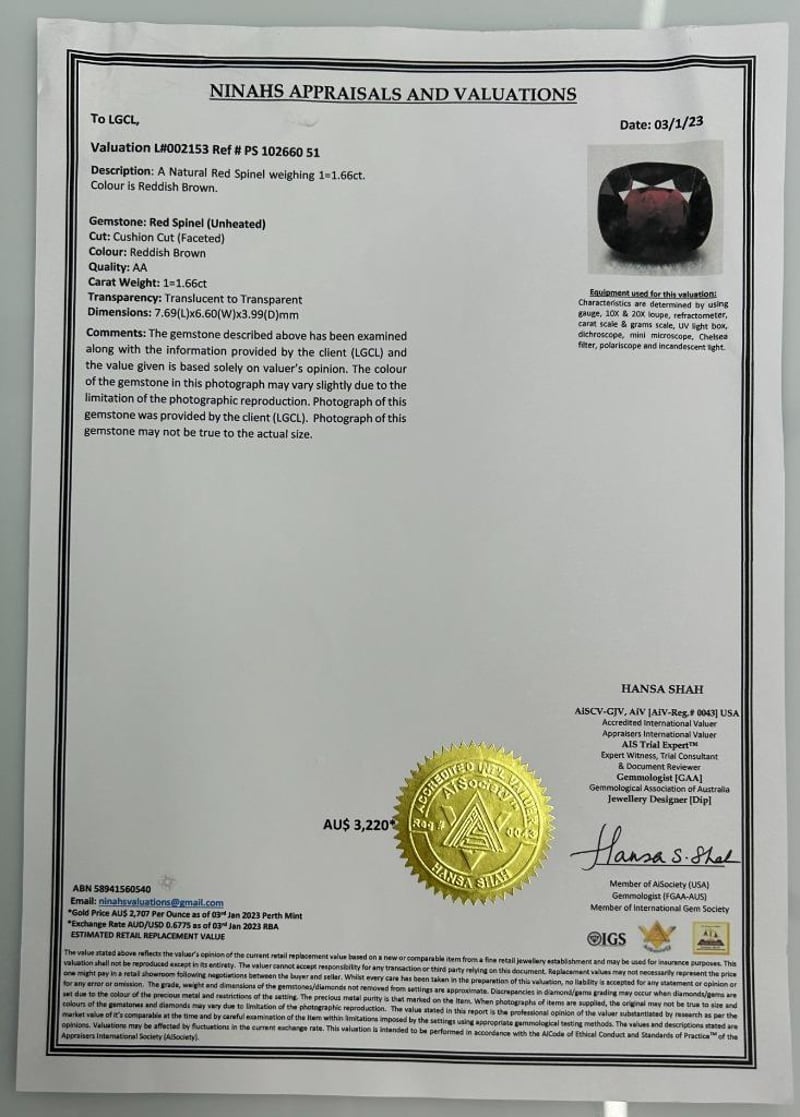 1.66CT NATURAL REDDISH BROWN RED SPINEL (UNHEATED), CUSHION CUT MEASURING 7.69 X 6.60 X 3.99MM, AA QUALITY, TRANSLUCENT TO TRANSPARENT. INCLUDES VALUATION CERTIFICATE $3,220.00.
