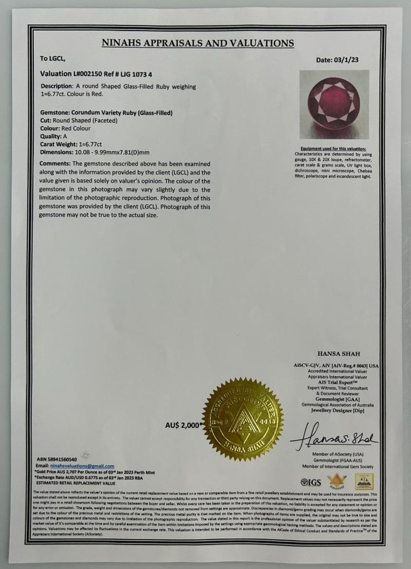6.77CT NATURAL RED GLASS-FILLED RUBY, ROUND FACETED CUT MEASURING 10.08 X 9.99 X 7.81MM, A QUALITY. INCLUDES VALUATION CERTIFICATE $2,000.00.Condition: Good - Refer To Images997339+4