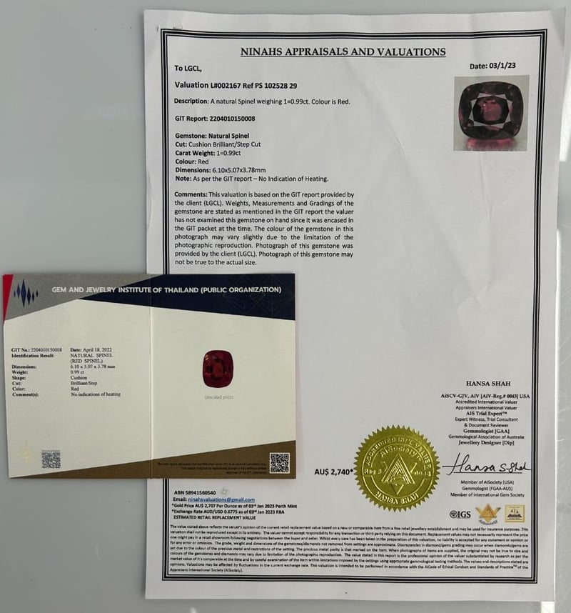 0.99CT NATURAL RED SPINEL (UNHEATED), CUSHION BRILLIANT STEP CUT MEASURING 6.10 X 5.73 X 3.78MM. INCLUDES GIT THAILAND CERTIFICATE CONFIRMING NO INDICATIONS OF HEATING AND VALUATION CERTIFICATE $2,740.00.
