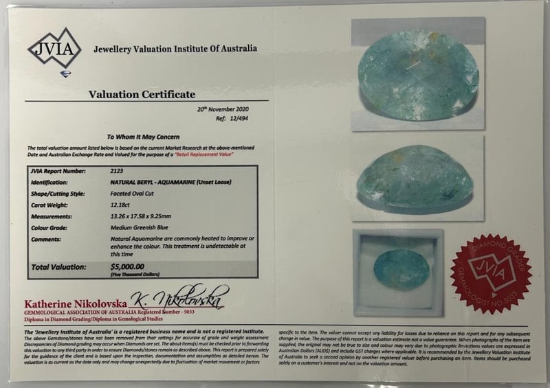 12.18CT NATURAL AQUAMARINE, FACETED OVAL CUT MEASURING 13.26 X 17.58 X 9.25MM, MEDIUM GREENISH-BLUE HUE. INCLUDES VALUATION CERTIFICATE $5,000.Condition: Good - Refer To Images997339+49