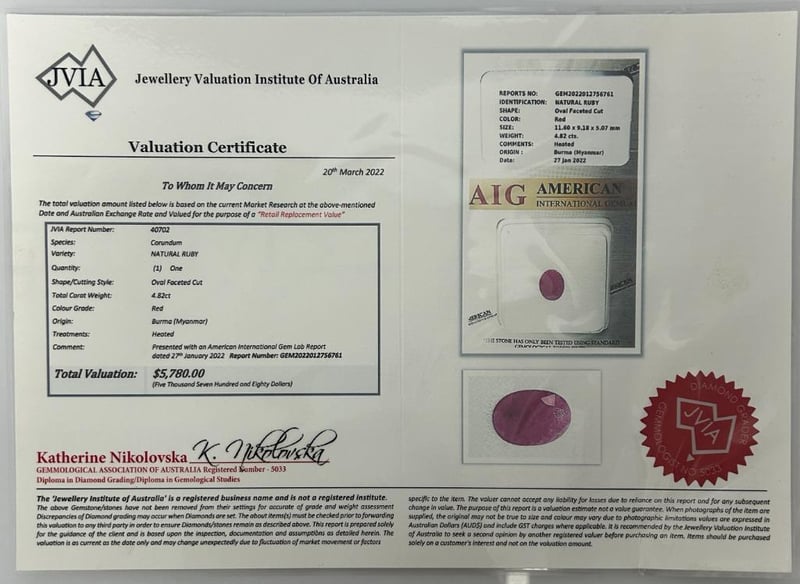 4.82CT NATURAL RUBY, OVAL FACETED CUT, VIVID RED COLOUR, ORIGIN BURMA (MYANMAR), HEATED. MEASURES 11.60 × 9.18 × 5.07MM. INCLUDES AIG GEM REPORT AND J.V.I.A. VALUATION CERTIFICATE — $5,780.Condition: Good - Refer To Images997339+80