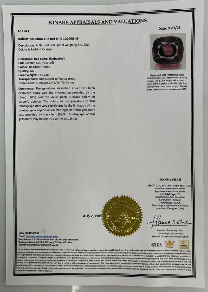 1.23CT NATURAL REDDISH ORANGE RED SPINEL (UNHEATED), CUSHION CUT MEASURING 5.79 X 5.24 X 4.70MM, AA QUALITY, TRANSLUCENT TO TRANSPARENT. INCLUDES VALUATION CERTIFICATE $2,390.00.Condition: Good - Refer To Images997339+45