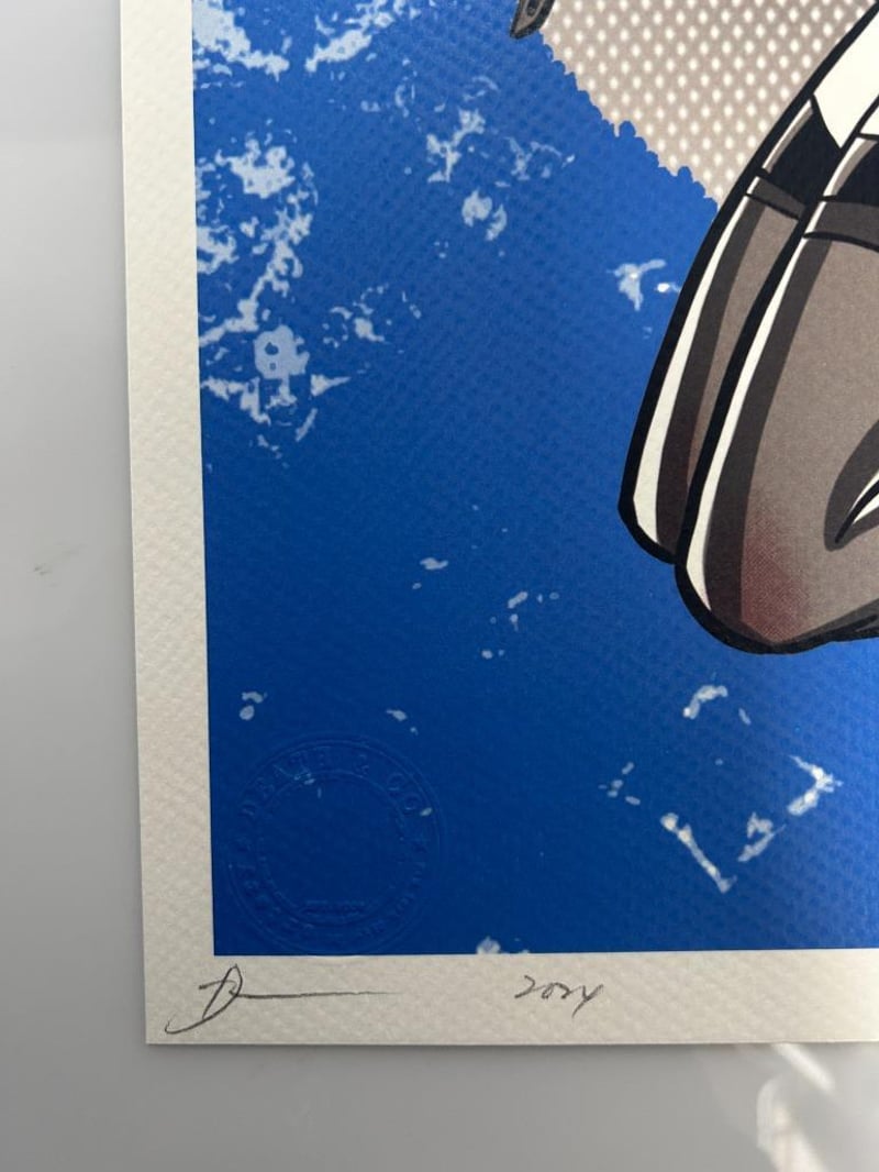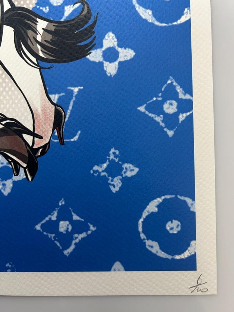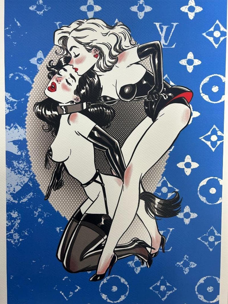 DEATH NYC SIGNED STREET ART PRINT 'COMIC - EROTIC TWO WOMEN IN LATEX' LIMITED EDITION, SIGNED LOWER LEFT, NUMBER 6/100 LOWER RIGHT, 300 MGS FINE ART PAPER, EMBOSSED WATERMARK LOWER LEFT IN IMAGE, IMAGE MEASURES 41.9X 29.6CM, TOTAL SHEET MEASURES 45 X 32CM. CERTIFICATE OF AUTHENTICITY PROVIDED BY DEATH NYC.