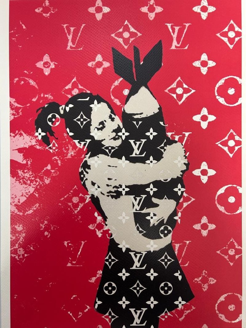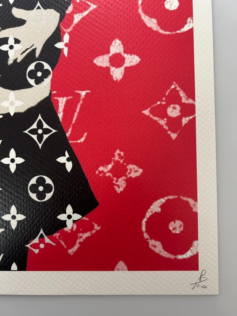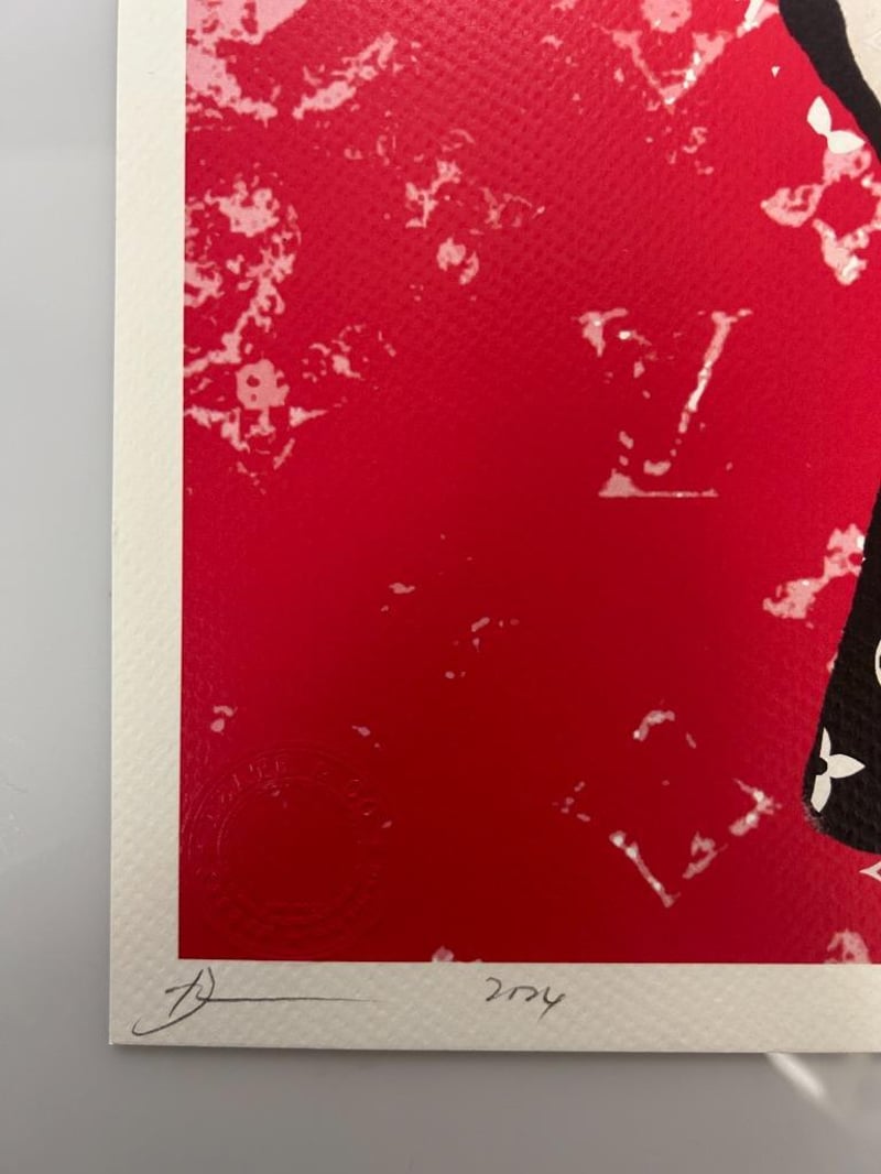 DEATH NYC SIGNED STREET ART PRINT 'BANKSY/LV STYLE' LIMITED EDITION, SIGNED LOWER LEFT, NUMBER 8/100 LOWER RIGHT, 300 MGS FINE ART PAPER, EMBOSSED WATERMARK LOWER LEFT IN IMAGE, IMAGE MEASURES 41.9X 29.6CM, TOTAL SHEET MEASURES 45 X 32CM. CERTIFICATE OF AUTHENTICITY PROVIDED BY DEATH NYC.Condition: Good - Refer To Images997339+28