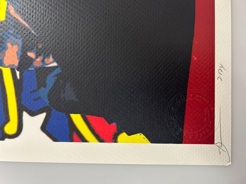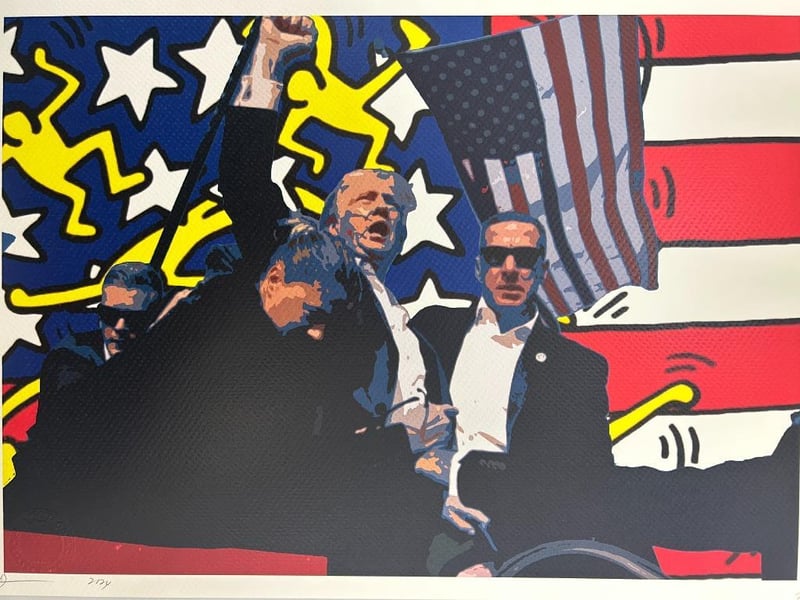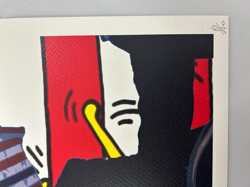 DEATH NYC SIGNED STREET ART PRINT 'KEITH HARING/TRUMP STYLE' LIMITED EDITION, SIGNED LOWER LEFT, NUMBER 87/100 LOWER RIGHT, 300 MGS FINE ART PAPER, EMBOSSED WATERMARK LOWER LEFT IN IMAGE, IMAGE MEASURES 41.9X 29.6CM, TOTAL SHEET MEASURES 45 X 32CM. CERTIFICATE OF AUTHENTICITY PROVIDED BY DEATH NYC.