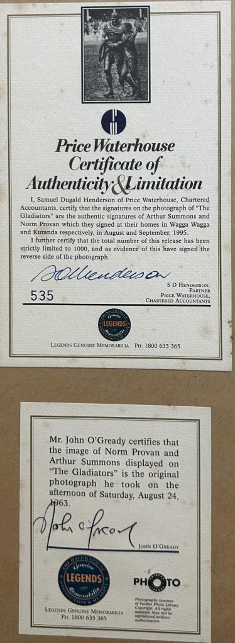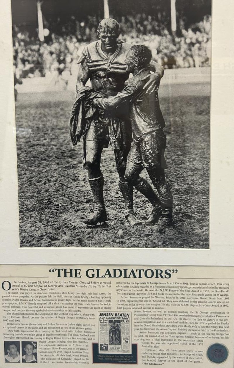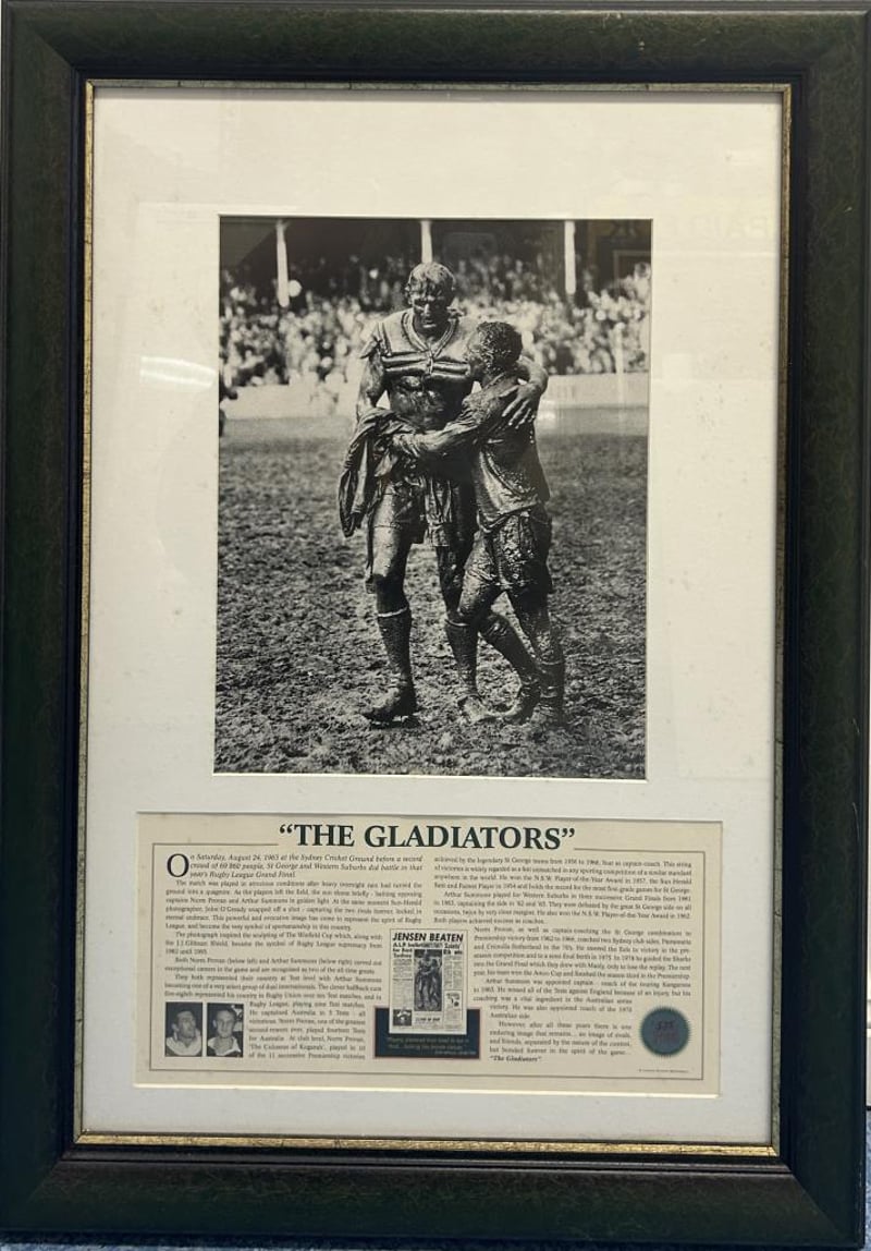 “THE GLADIATORS” LIMITED EDITION FRAMED PRINT, DEPICTING THE ICONIC PHOTOGRAPH CAPTURED AFTER THE 1963 RUGBY LEAGUE GRAND FINAL BETWEEN ST GEORGE AND WESTERN SUBURBS AT THE SYDNEY CRICKET GROUND. THIS LEGENDARY IMAGE SHOWS OPPOSING CAPTAINS EMBRACING IN THE MUD, SYMBOLIZING TRUE SPORTSMANSHIP AND RESPECT IN RUGBY LEAGUE HISTORY. ACCOMPANIED BY DETAILED BACKGROUND TEXT DESCRIBING THE MATCH AND ITS HISTORICAL SIGNIFICANCE, THE PROFESSIONALLY FRAMED PIECE MEASURES 62 X 89 CM. THIS COLLECTIBLE ITEM HAS BEEN PROFESSIONALLY VERIFIED AS A GENUINE PRODUCT AND COMES WITH AN ACCOMPANYING 3RD PARTY CERTIFICATE OF AUTHENTICITY.