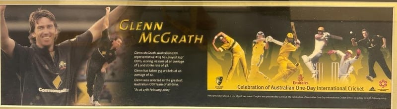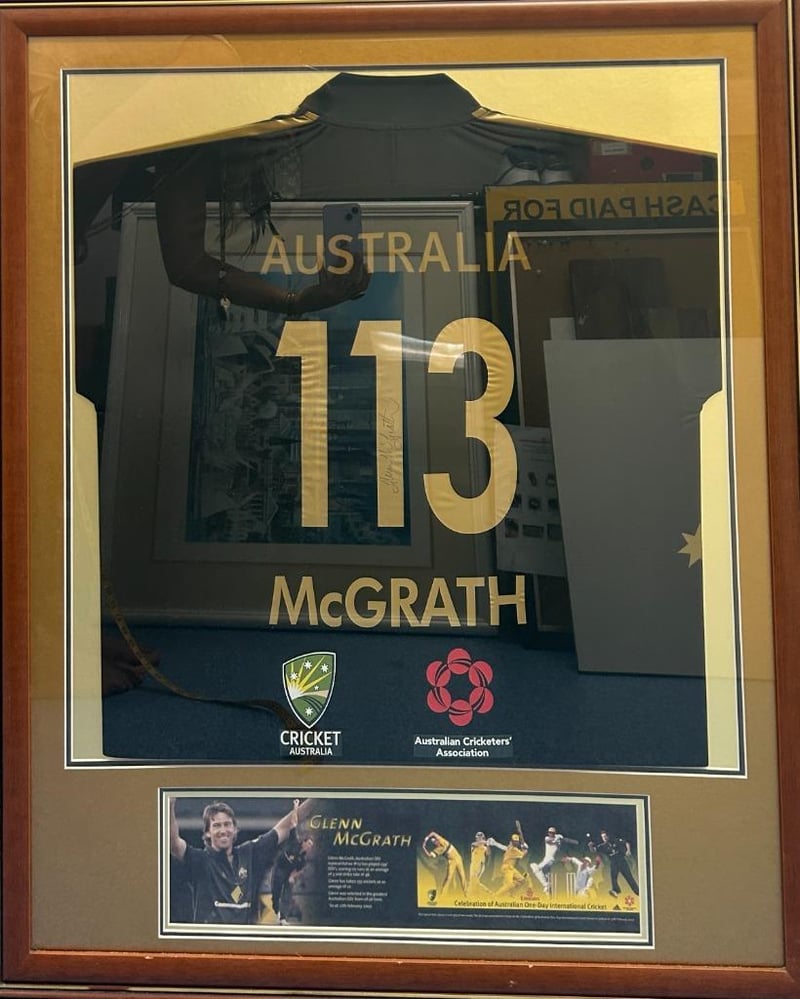 GLENN MCGRATH SIGNED LIMITED EDITION AUSTRALIAN ODI JERSEY, FEATURING MCGRATH’S OFFICIAL PLAYER NUMBER 113, CELEBRATING HIS OUTSTANDING INTERNATIONAL CRICKET CAREER. ENDORSED BY CRICKET AUSTRALIA AND THE AUSTRALIAN CRICKETERS’ ASSOCIATION, THIS FRAMED TRIBUTE INCLUDES IMAGERY AND CAREER HIGHLIGHTS OF ONE OF AUSTRALIA’S GREATEST FAST BOWLERS. PROFESSIONALLY FRAMED AND PRESENTED, MEASURING 81 X 98 CM.