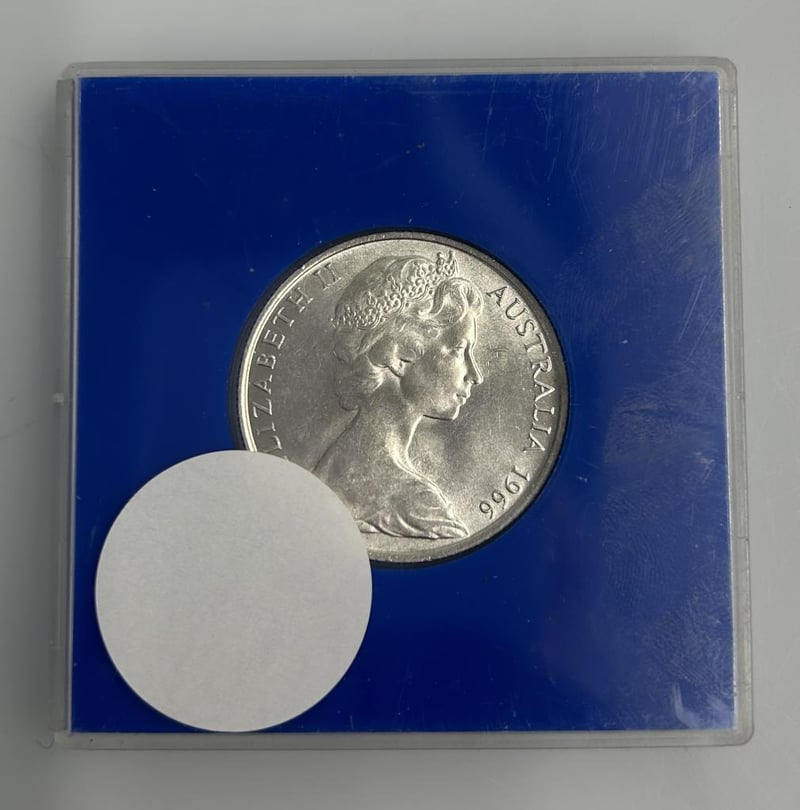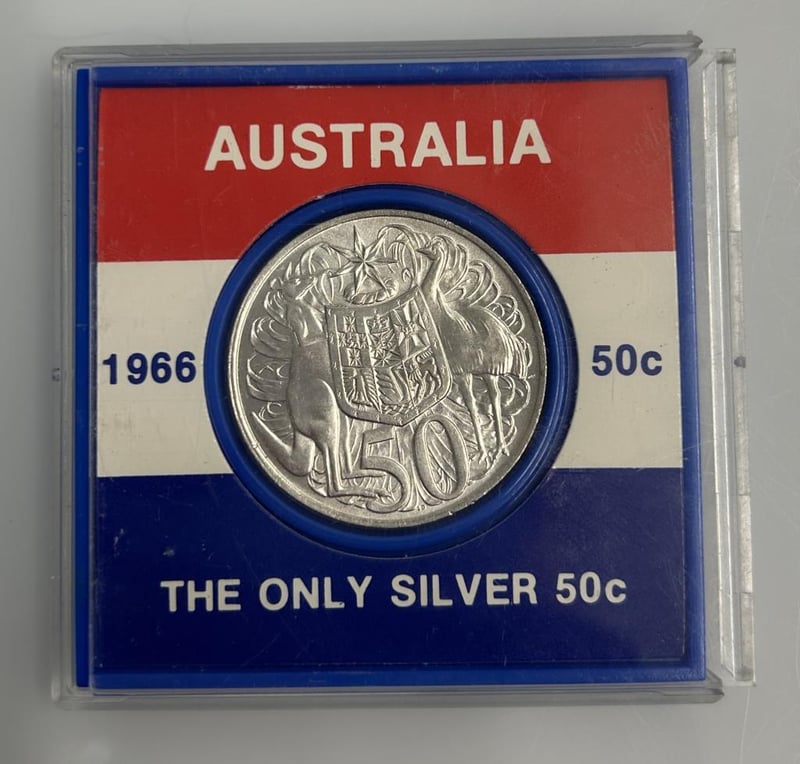 1966 AUSTRALIAN ROUND 50 CENT COIN — THE ONLY YEAR STRUCK IN 80% SILVER. FEATURES THE AUSTRALIAN COAT OF ARMS. PRESENTED IN ORIGINAL BLUE, WHITE, AND RED DISPLAY CASE. EXCELLENT CONDITION.