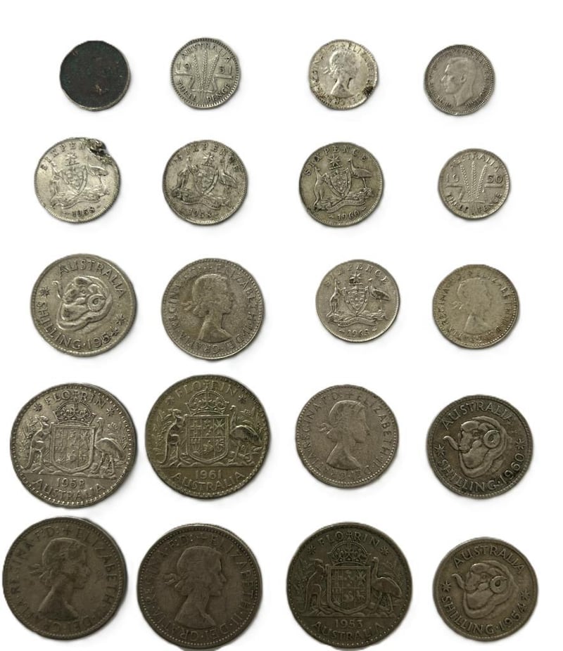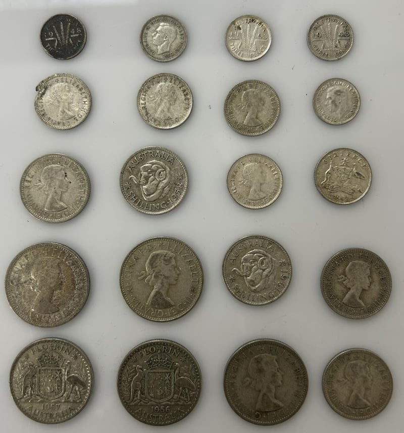 ASSORTED VINTAGE AUSTRALIAN SILVER COIN COLLECTION (PRE-DECIMAL). A MIXED LOT OF 15 CIRCULATED AUSTRALIAN SILVER AND COPPER-NICKEL COINS, INCLUDING FLORINS, SHILLINGS, SIXPENCES, AND THREEPENCES, DATING PRIMARILY FROM THE 1930S–1960S. MOST COINS FEATURE EFFIGIES OF KING GEORGE VI AND QUEEN ELIZABETH II, WITH DENOMINATIONS SUCH AS 1951–1961 FLORINS, 1953–1964 SHILLINGS, AND 1948–1963 SIXPENCES/THREEPENCES.