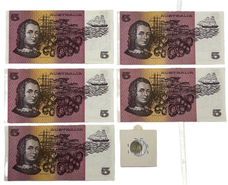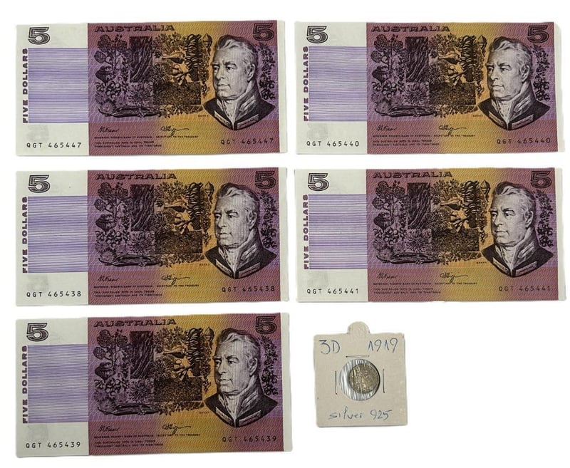 COLLECTION OF AUSTRALIAN $5 PAPER BANKNOTES FEATURING TWO HISTORICAL DESIGNS. THE FIRST SERIES DEPICTS CAROLINE CHISHOLM ALONGSIDE COLONIAL SETTLEMENT SCENES AND SAILING SHIPS, WHILE THE SECOND SERIES SHOWCASES SIR JOSEPH BANKS WITH BOTANICAL ILLUSTRATIONS REPRESENTING AUSTRALIA’S NATURAL HISTORY. NOTES ARE IN CRISP, UNCIRCULATED OR NEAR-UNCIRCULATED CONDITION, WITH CONSECUTIVE SERIAL NUMBERS IN EACH SET. INCLUDES ONE 1919 THREEPENCE (.925 SILVER) COIN FOR ADDED COLLECTOR INTEREST.
