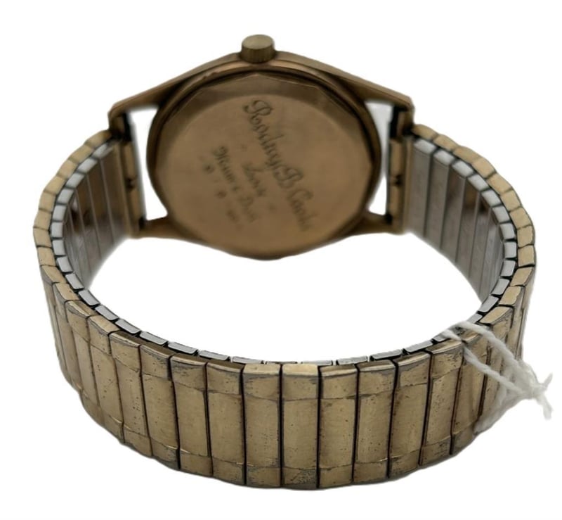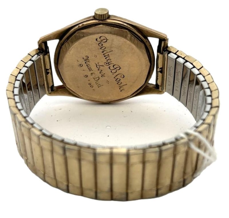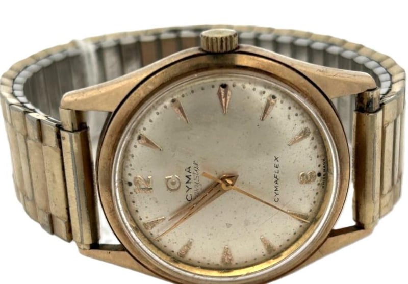 CYMA NAVYSTAR CYMAFLEX 9CT GOLD 1960 VINTAGE WATCH, LIGHT GOLD COLOUR DIAL WITH GOLD-TONE NUMERICAL/POINTED BATON HOUR MARKERS, CASE MEASURES 34MM, MANUAL WIND MOVEMENT, SWISS MADE, GOLD-TONE STAINLESS STEEL STRETCH BRACELET, CIRCA 1960. NOTE: PATINA ON DIAL/ENGRAVING ON BACK OF CASE.