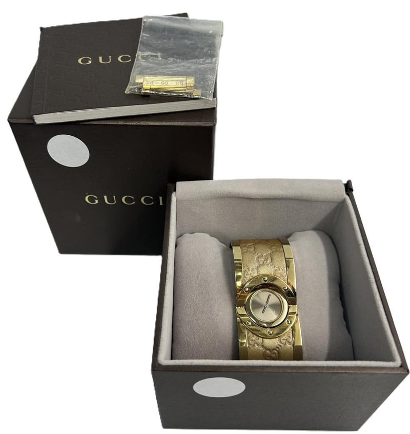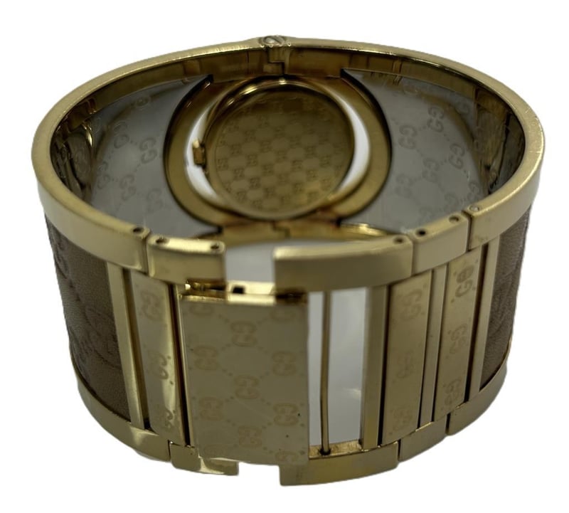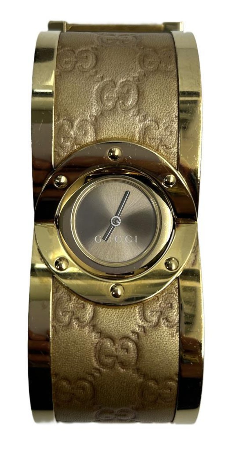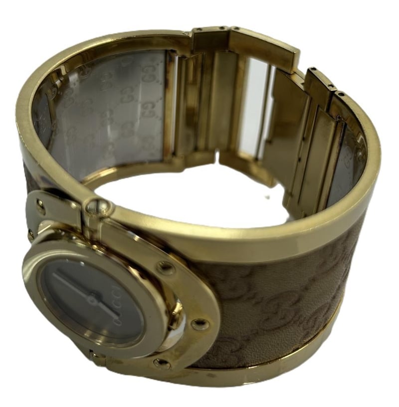 GUCCI TWIRL MONOGRAM GOLD WATCH, MODEL 112, GOLD-TONE CASE AND WIDE BANGLE BRACELET FEATURING EMBOSSED GG MONOGRAM LEATHER PANELS, SUNBURST CHAMPAGNE DIAL WITH GUCCI LOGO, CASE MEASURES 35MM, SWISS MADE, QUARTZ MOVEMENT, BANGLE-STYLE BRACELET WITH FOLDING CLASP, INCLUDES ORIGINAL GUCCI BOX, BOOKLET, AND SPARE LINKS.