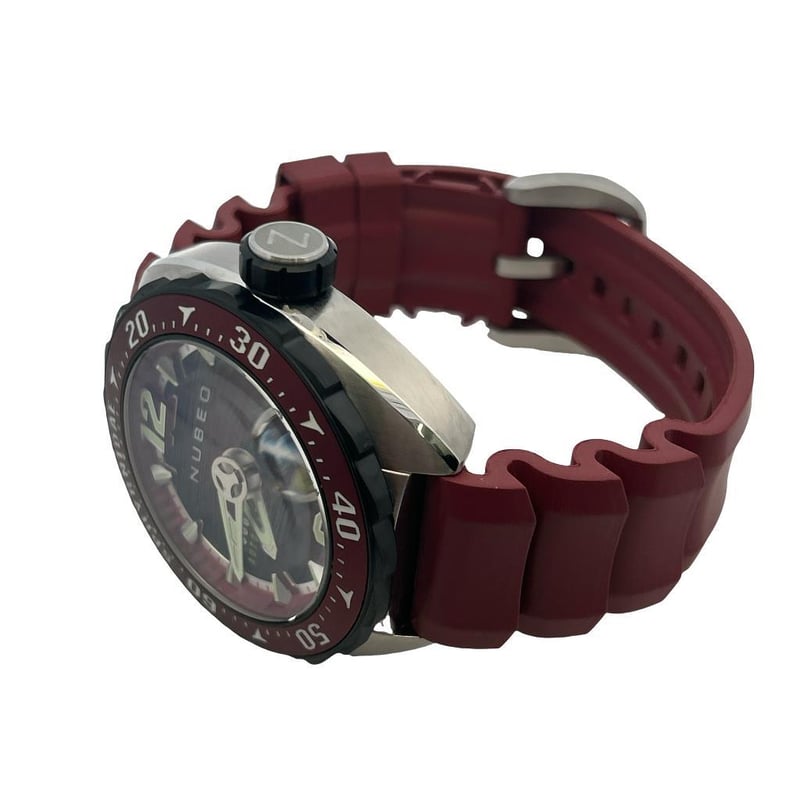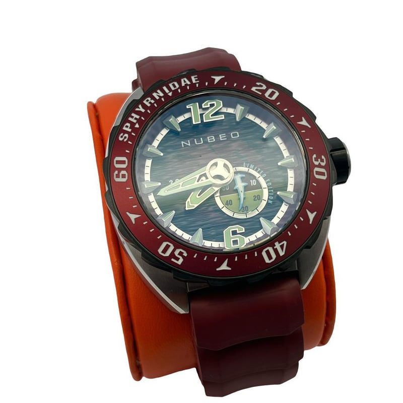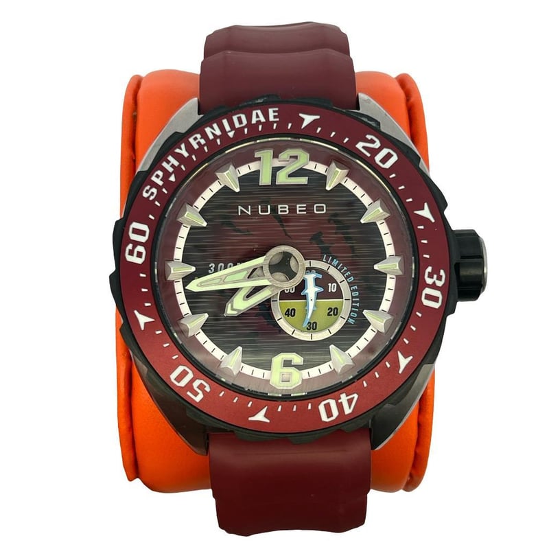 NUBEO SPHYRNIDAE AUTOMATIC 300M LIMITED EDITION WATCH, REFERENCE: NB-6092, RED/BLACK SWIMMING SHARKS DIAL SILVER-TONE POINTED BATON HOUR MARKERS & SUB-DIAL, CASE MEASURES 44MM, SAPPHIRE CRYSTAL, WATER RESISTANT 300M, AUTOMATIC MOVEMENT, LIMITED EDITION 26/100, MAROON SILICON RUBBER STRAP WITH SILVER-TONE BUCKLE, ORIGINAL BOX & PAPERS.
