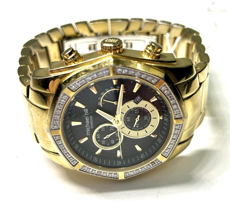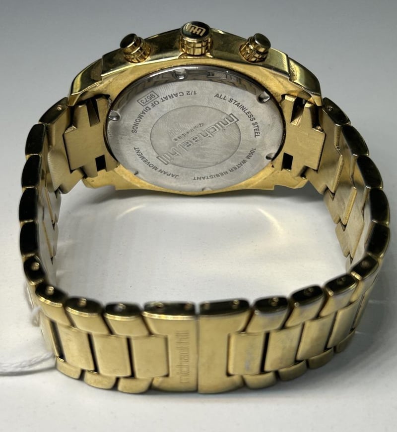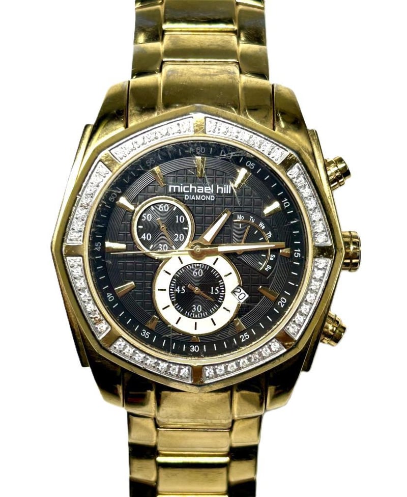 MICHAEL HILL DIAMOND CHRONOGRAPH WATCH, MODEL 9573, BLACK DIAL, GOLD TONE BATON HOUR MARKERS, DATE DISPLAY, 0.50CT ROUND BRILLIANT CUT DIAMONDS GRAIN SET AROUND THE BEZEL, CASE MEASURES 45MM, WR100M, QUARTZ MOVEMENT, GOLD TONE STAINLESS STEEL BRACELET WITH DOUBLE DEPLOYMENT CLASP.
