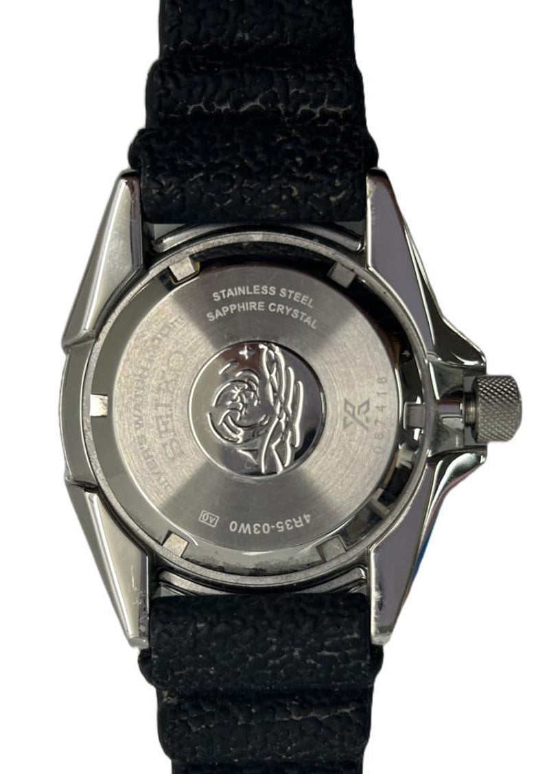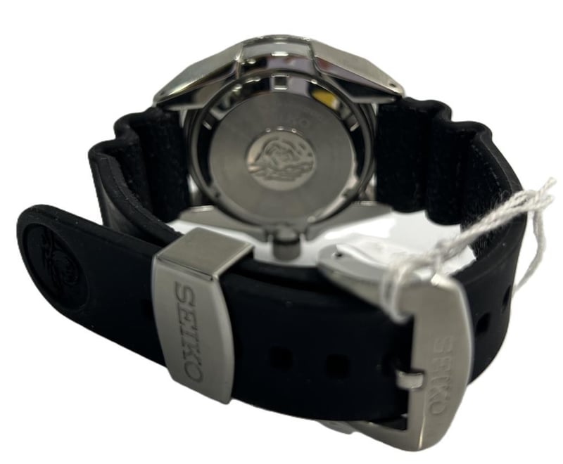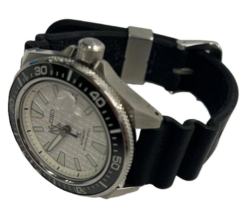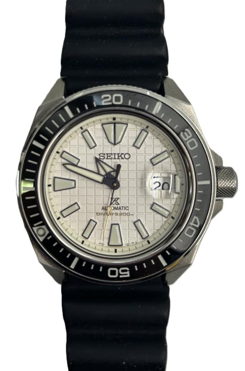 SEIKO Prospex Samurai Diver Automatic Watch, model SRPE37 (ref. 4R35-03W0), featuring a white waffle-textured dial, luminous hands and markers, unidirectional black bezel, and date magnifier at 3 o’clock. 44mm Stainless steel case with screw-down crown, sapphire crystal, automatic movement cal. 4R35, water resistant to 200 m, black Seiko rubber strap with stainless steel buckle. Excellent condition with minor wear.