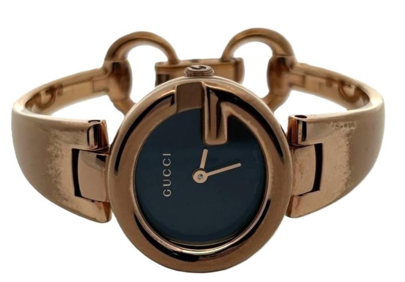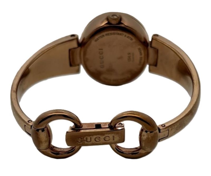 GUCCI GUCCISSAMA LADIES BRACELET WATCH, REFERENCE: 134.5, BLACK DIAL WITH ROSE GOLD-TONE HANDS, G-STYLE CASE MEASURES 28X24MM, QUARTZ MOVEMENT, SWISS MADE, WATER RESISTANT 50M, ROSE GOLD-TONE STAINLESS STEEL BRACELET WITH FOLD OVER HORSE-BIT CLASP. NOTE PART GOLD PLATING WORN ON THE TOP OF THE BRACELET, SEE PHOTOS.