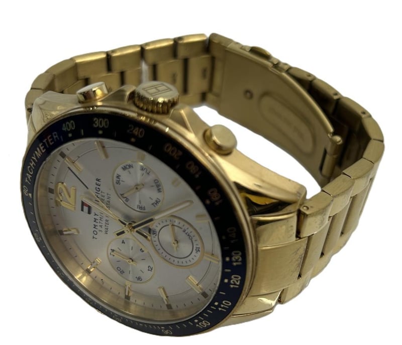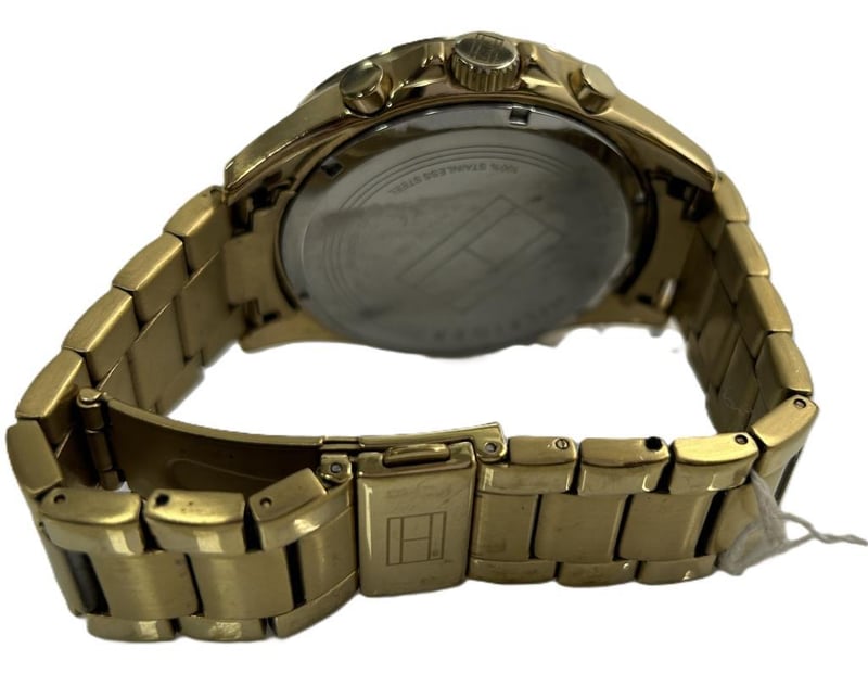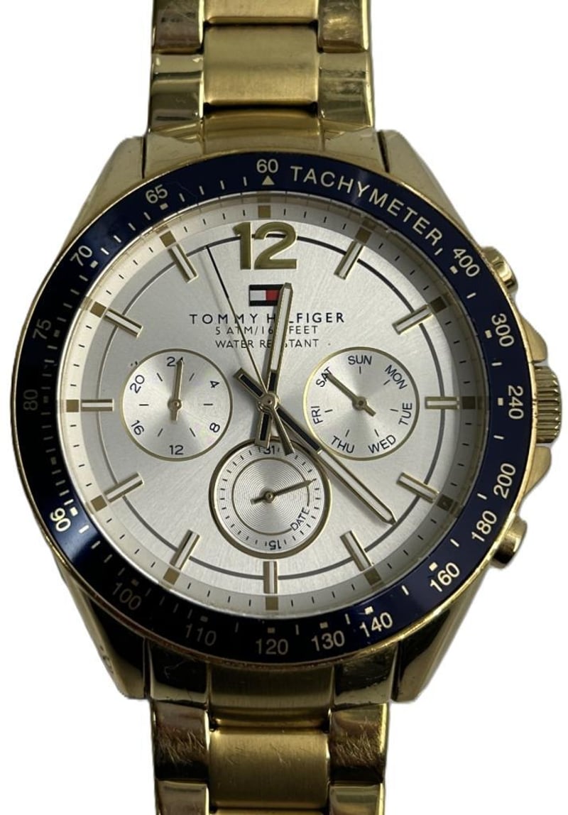 TOMMY HILFIGER CHRONOGRAPH GOLD WATCH, SILVER DIAL WITH GOLD-TONE HANDS AND INDICES, THREE SUBDIALS DISPLAYING 24-HOUR TIME, DAY, AND DATE, GOLD STAINLESS STEEL CASE AND BRACELET, TACHYMETER BEZEL, QUARTZ CHRONOGRAPH MOVEMENT, CASE DIAMETER 46MM, WATER RESISTANT TO 50M, PUSH BUTTON DEPLOYMENT CLASP, EXCELLENT CONDITION WITH LIGHT WEAR.