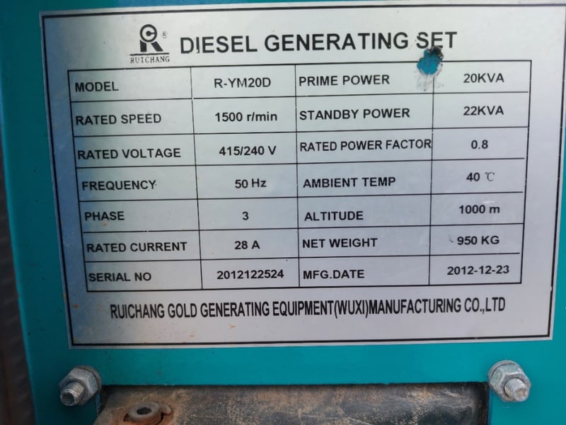 Rutchang Diesel Generator SetMake: RutchangModel: R-YM20DYear: 2012Serial Number: 2012122524Rated Voltage: 415/240 VPhase: 3Weight: 950 kgGenerator starts and turns off automatically. Refer to video