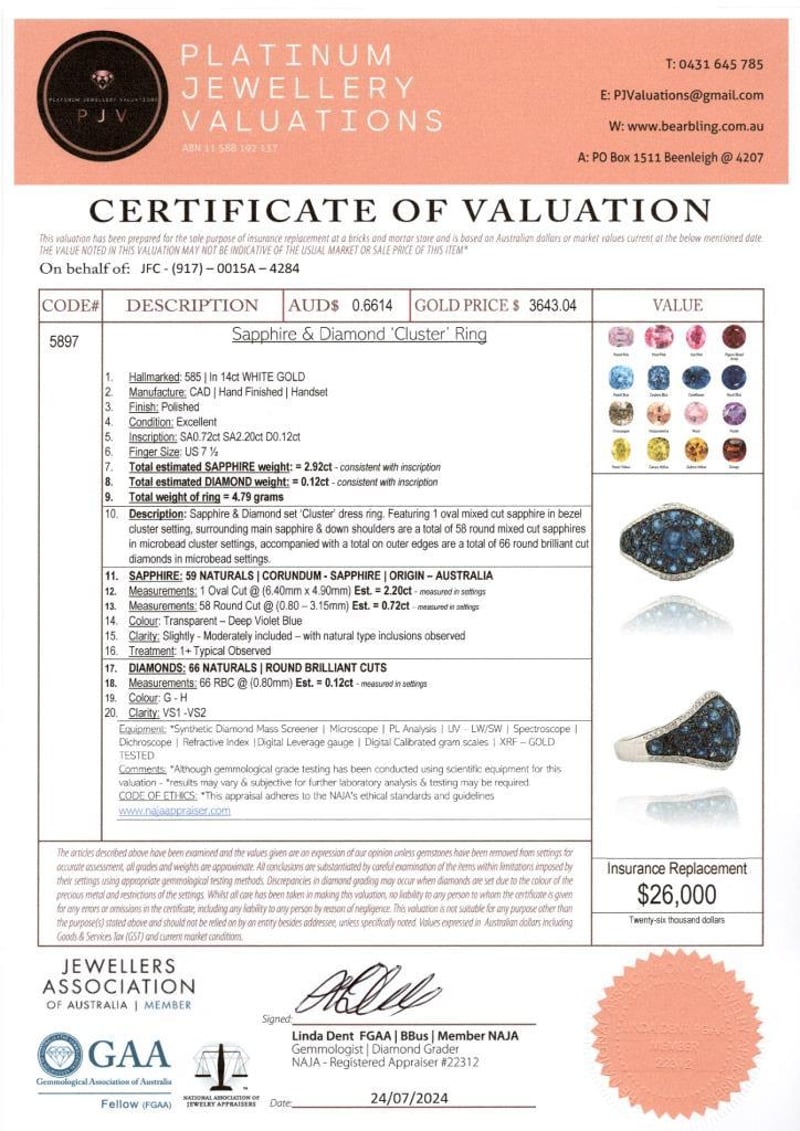 14CT WHITE GOLD AUSTRALIAN SAPPHIRE AND DIAMOND CLUSTER RING 14Ct White Gold Australian Sapphire And Diamond Cluster Ring Featuring Centre, 59 Round Cut, Deep Violet Blue Australian Sapphires (2.92Ct Tsw, Slightly-Moderately Included), Bead Set, With 66 Round Brilliant Cut Diamonds (0.12Ct Tdw, G-H Colour, Vs1-Vs2 Clarity), Bead Set. Ring Size O. Jewellery Valuations Provided By A Third Party Professional Not Directly Associated With Lloyds Auctions at AUD $26000This Insurance Valuation has been provided by a registered Jewellery Valuer and is intended for insurance purposes only. The valuation amount has no bearing on the auction value of the item. Any questions regarding the valuation should be directed to the issuing Valuer (refer to contact details on the certificate) as Lloyds have no association or relationship with the Valuer or the valuation amount contained within the valuation. 0586248+556