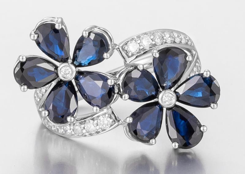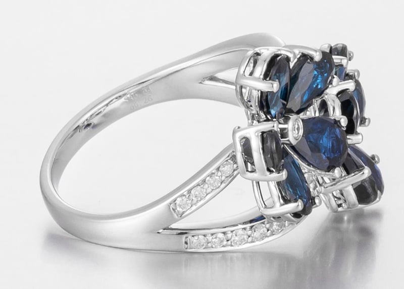 14CT WHITE GOLD AUSTRALIAN SAPPHIRE AND DIAMOND FLORAL TWIST RING 14Ct White Gold Australian Sapphire And Diamond Floral Twist Ring Featuring Centre, 10 Oval Cut, Dark Blue Australian Sapphires (5.54Ct Tsw, Moderately Included), Claw Set, With 24 Round Brilliant Cut Diamonds (0.26Ct Tdw, F-G Colour, Vs1-Vs2 Clarity), Bead Set. Ring Size O. Jewellery Valuations Provided By A Third Party Professional Not Directly Associated With Lloyds Auctions at AUD $26000This Insurance Valuation has been provided by a registered Jewellery Valuer and is intended for insurance purposes only. The valuation amount has no bearing on the auction value of the item. Any questions regarding the valuation should be directed to the issuing Valuer (refer to contact details on the certificate) as Lloyds have no association or relationship with the Valuer or the valuation amount contained within the valuation. 0586248+555