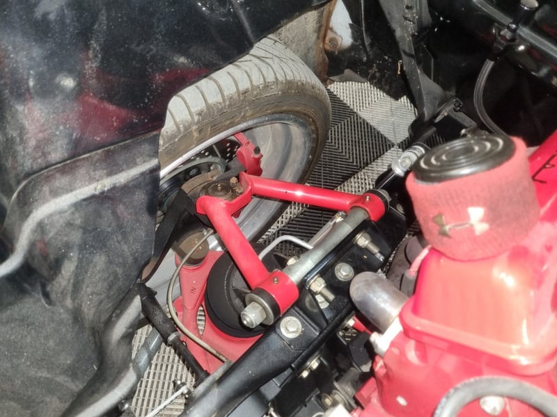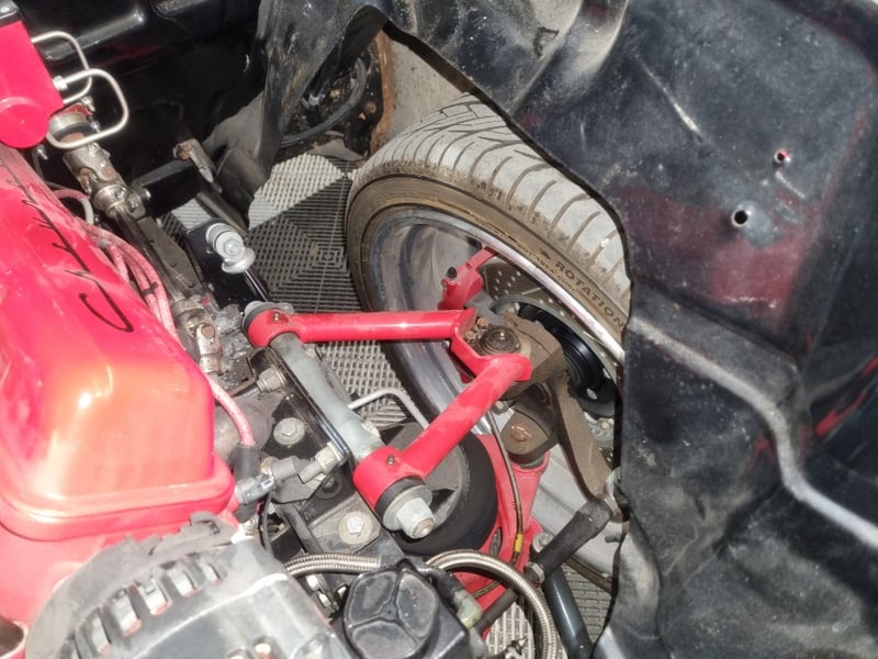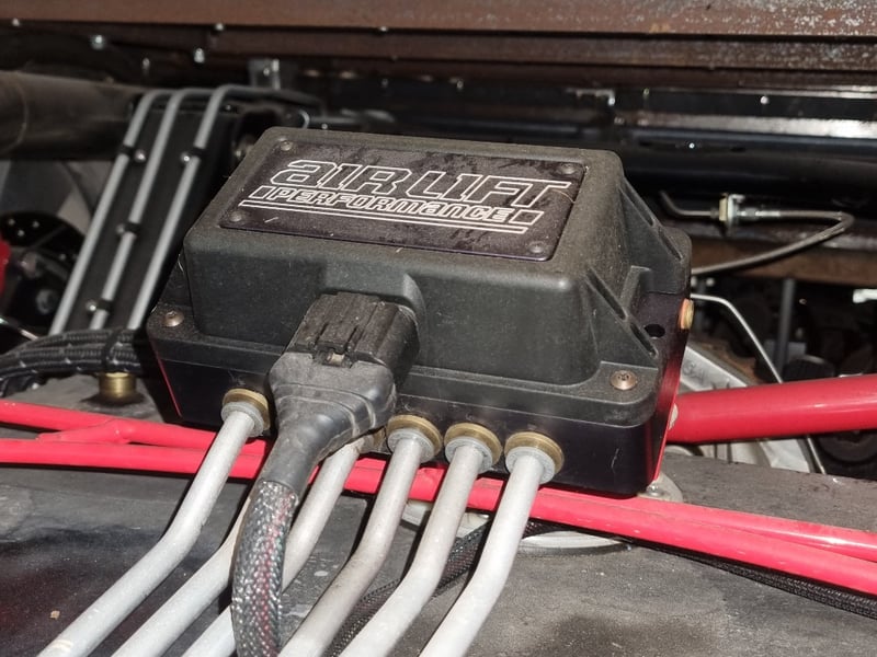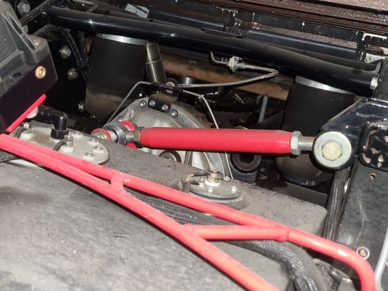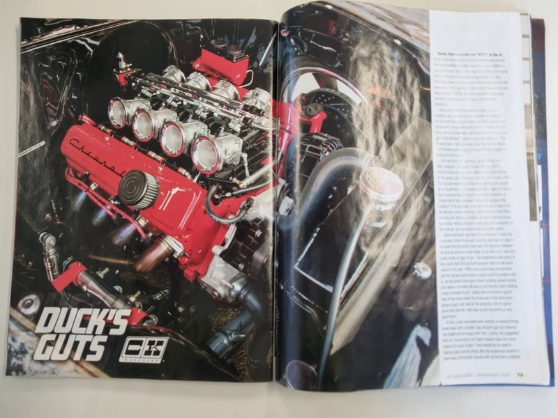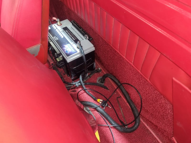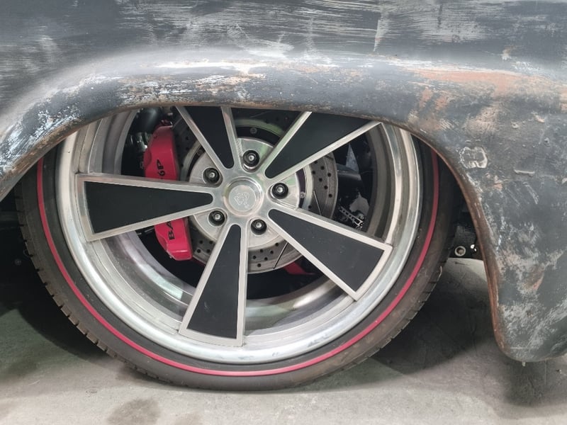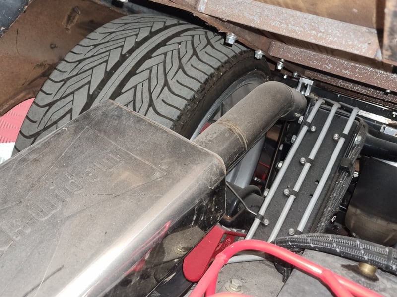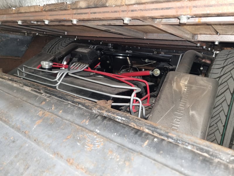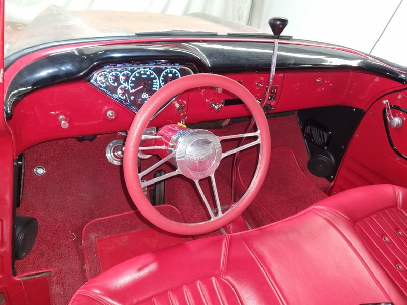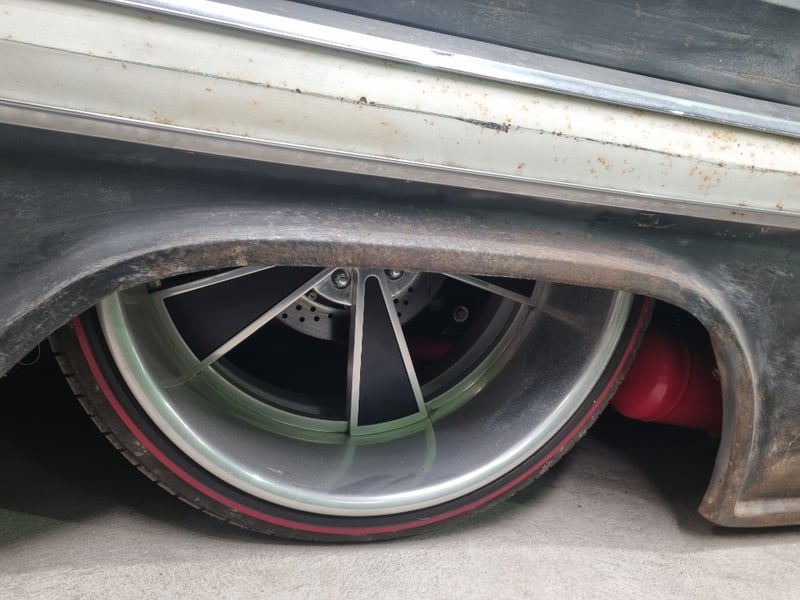 The chassis and suspension feature extensive upgrades including a Porterbuilt Dropmember system, rear 4-link with Watts link and Panhard bar, Firestone airbags (remote controlled), rack and pinion steering, QA1 shocks, CPP spindles, Baer 6P brakes, Remaster master cylinder, and Wilwood pedal assembly. Large Esajian Slingshot wheels (22x8.5 front, 22x12 rear) with Diamondback Redline tyres complete the stance.