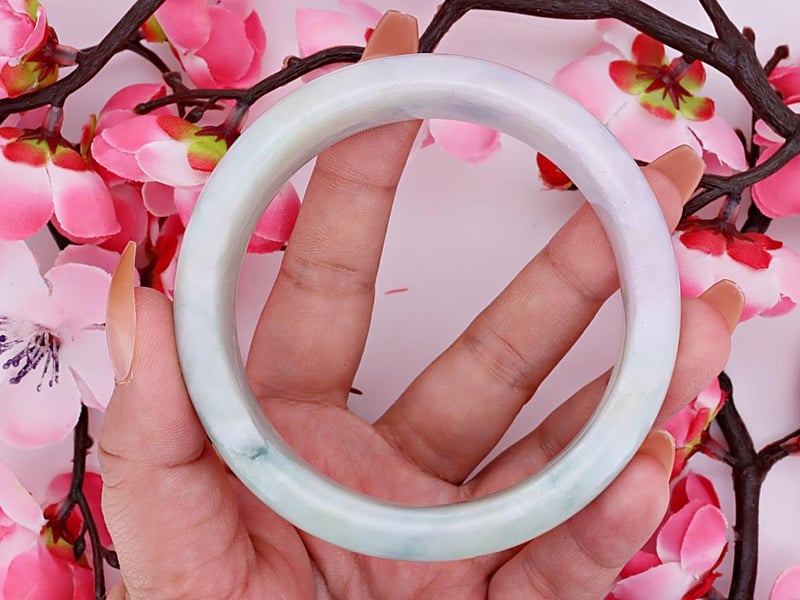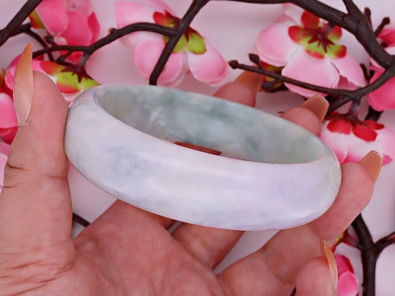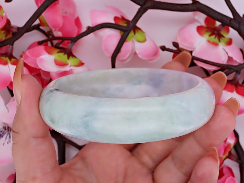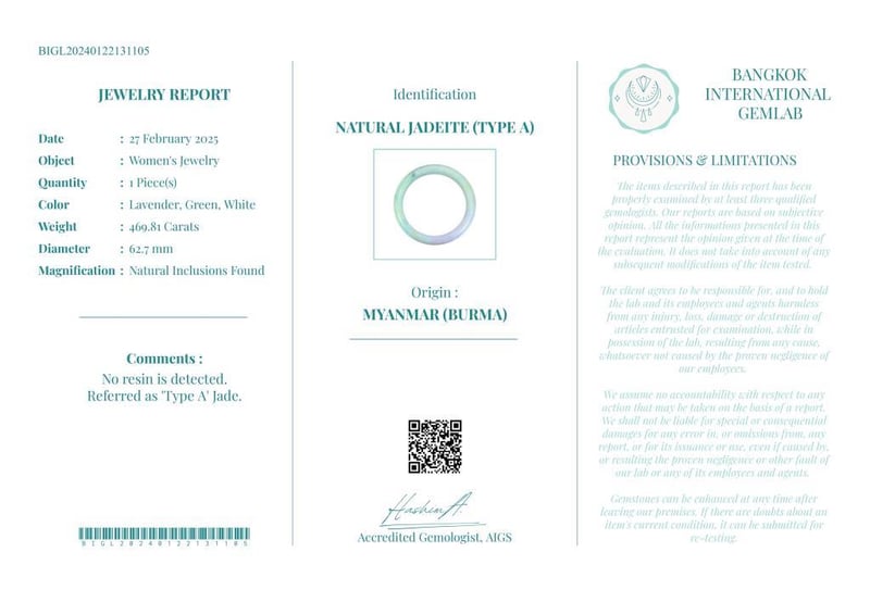 NATURAL BURMESE JADE BANGLE - WITH CERTIFICATE Gemstone : Natural Burmese JadeCertificate Number : Bigl20240122131105Item Total Weight : 469.81 GramsMain Stone Color : Lavender, Green, WhiteSize : 62.7Comments : No Resin Is Detected.Referred As 'Type A' Jade. ✻ Verify Report Online At Www.Bangkokinternationalgemlab.Co 0+3