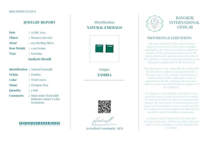 Comments : Main Stone (Emerald) Indicates Minor Cedar Treatment.