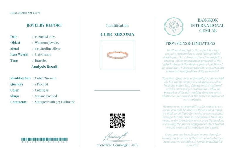 CUBIC ZIRCONIA BRACELET ON 925 SILVER - WITH CERTIFICATE Gemstone : Cubic ZirconiaCertificate Number : Bigl20240122133271Item Total Weight : 8.26 GramsMain Stone Color : ColorlessSize : 1Comments : Stamped With 925 Hallmark. ✻ Verify Report Online At Www.Bangkokinternationalgemlab.Co 0+53