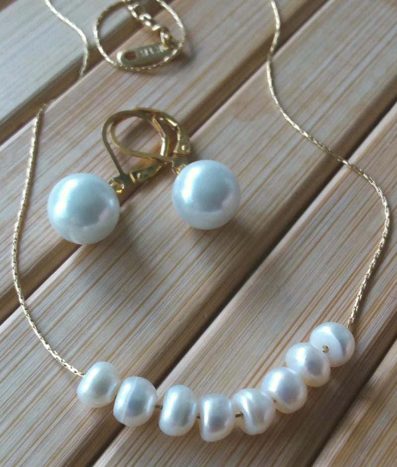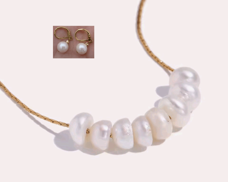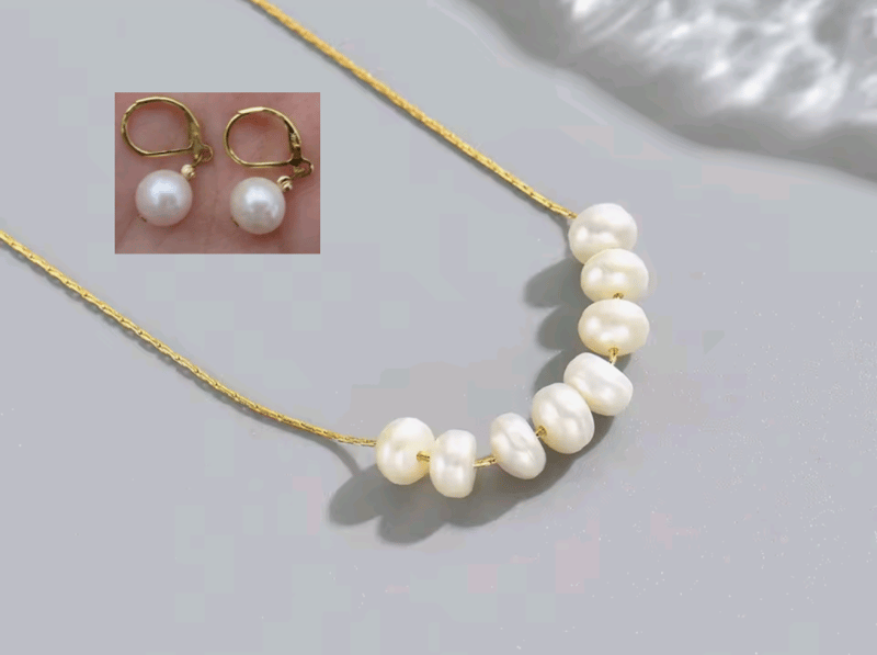 8 X FRESHWATER PEARLS ON STAINLESS STEEL GOLD CHAIN WITH SHELL PEARL HUGGIE EARRINGS