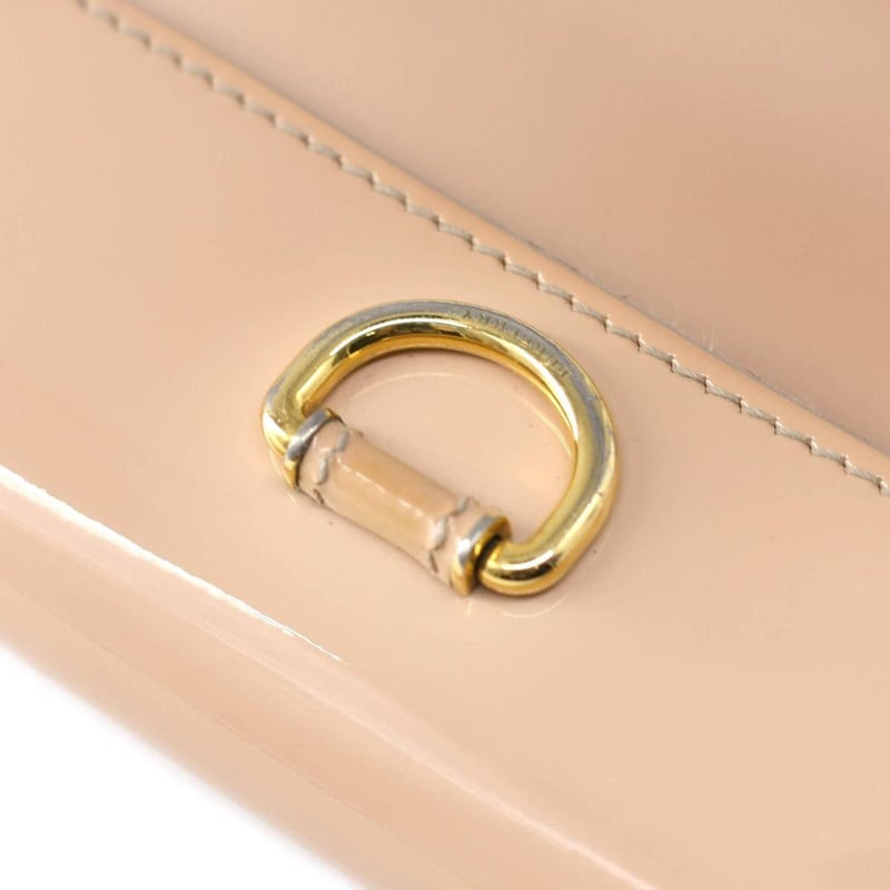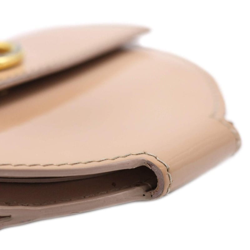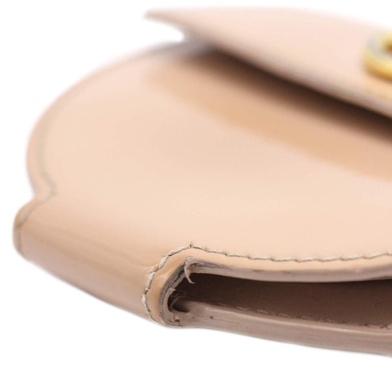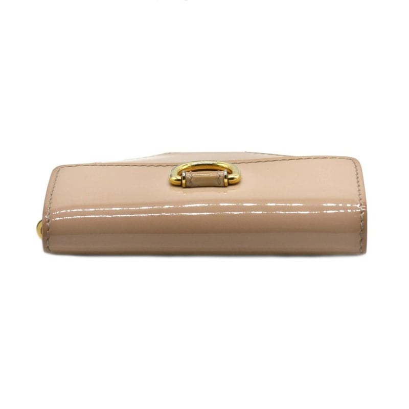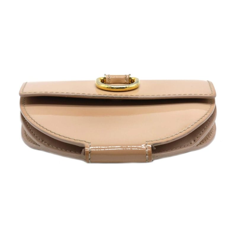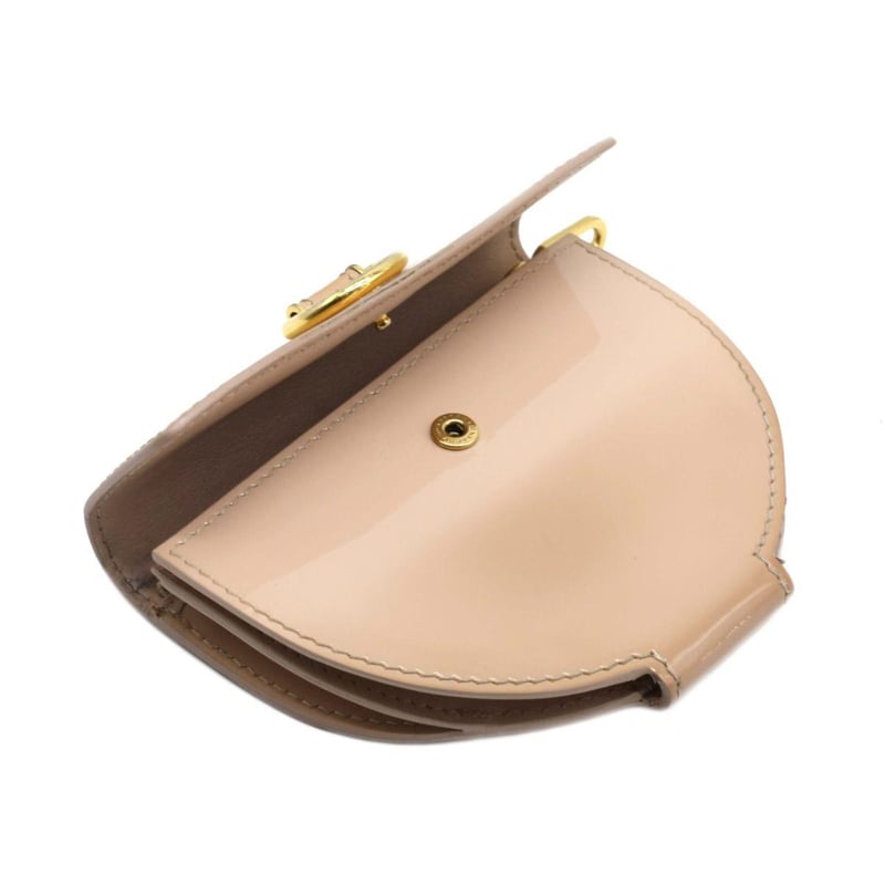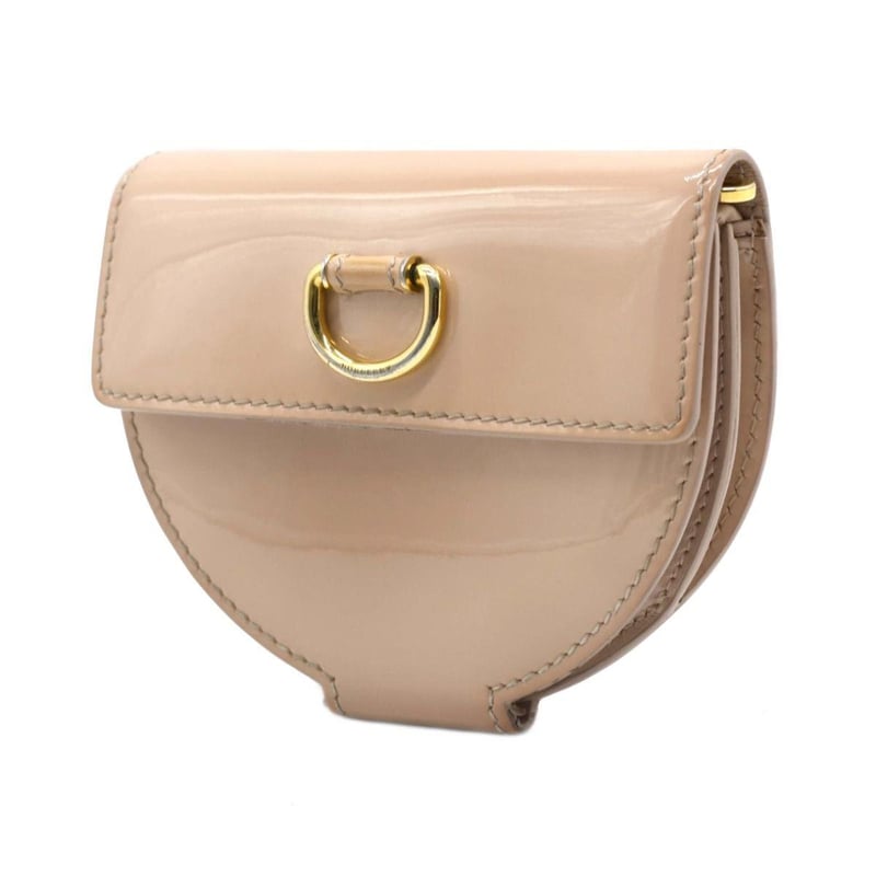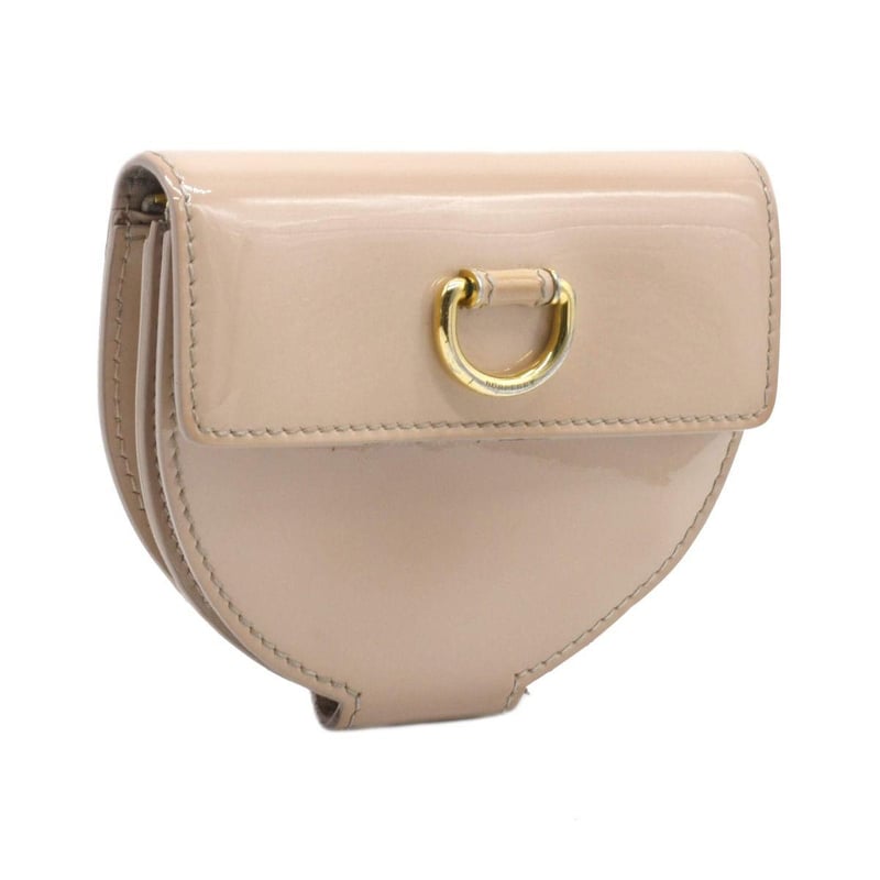 BURBERRY D-RING DETAIL PATENT LEATHER COIN CASE Length: 12.5cm Height: 10.5cm Depth: 2.5cm Exterior Material Patent leather with gold-tone hardware and snap button closure. Interior Material Leather lining with a zipped pocket and multiple card slots. Additional Condition Report - Moderate wear and stains on exterior - Visible scuffs and creases on exterior corners and edges - Moderate wear and stains on interior - Moderate scratches and tarnished on hardware Comes With - Original Box - Original Dustbag - Care Booklet - Certificate of Authenticity CROSSED DOCKED 155261+4