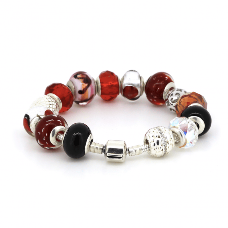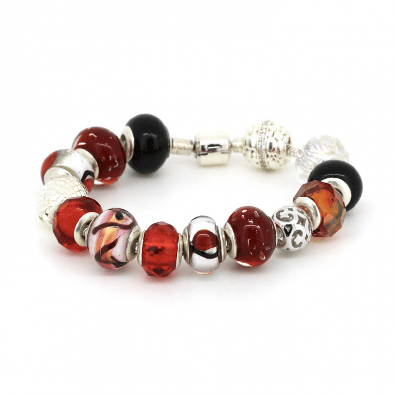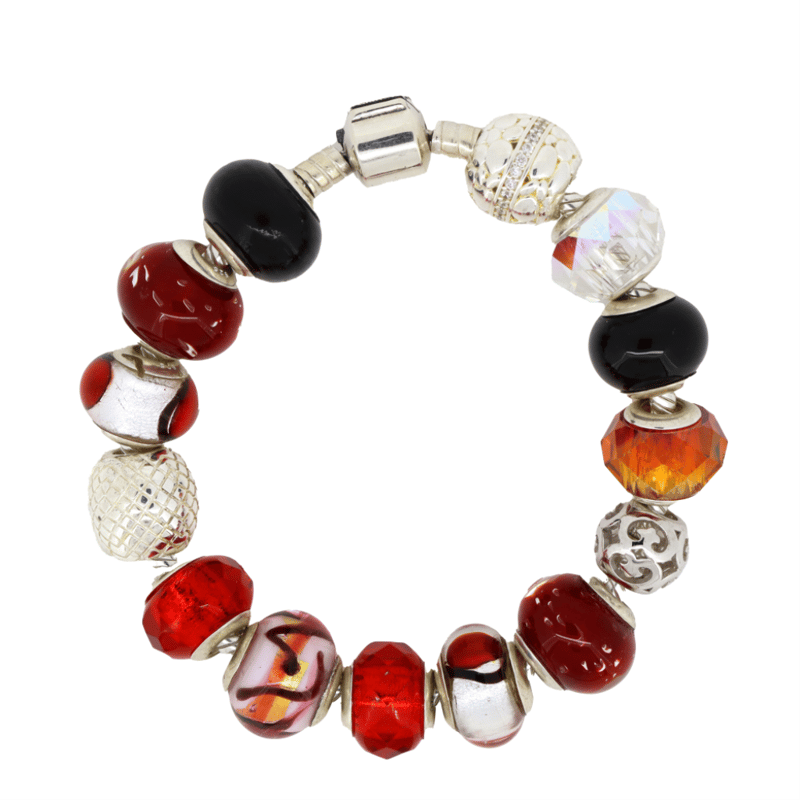 STERLING SILVER AND MURANO GLASS BEAD, CHARM BRACELET. THE BRACELET FEATURES, 14 MURANO GLASS BEAD AND STERLING SILVER CHARMS. THE BRACELET HAS A SNAP LOCK CLASP. BRACELET LENGTH IS 18CM.
