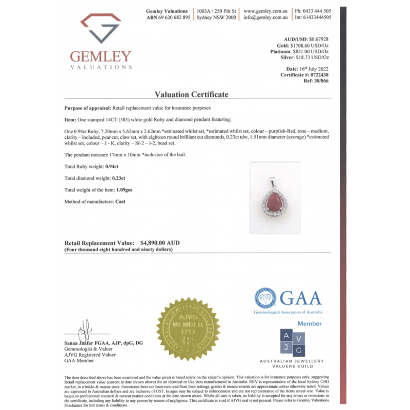 This Insurance Valuation has been provided by a registered Jewellery Valuer and is intended for insurance purposes only. The valuation amount has no bearing on the auction value of the item. Any questions regarding the valuation should be directed to the issuing Valuer (refer to contact details on the certificate) as Lloyds have no association or relationship with the Valuer or the valuation amount contained within the valuation.
