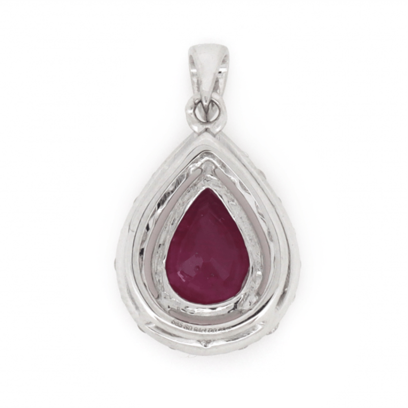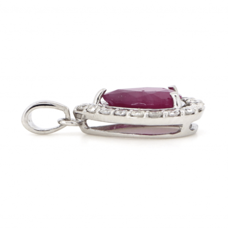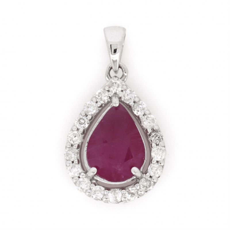 14K WHITE GOLD, RUBY AND DIAMOND, HALO PENDANT. THE CENTRE FEATURES, ONE PEAR CUT, MEDIUM PURPLISH-RED, RUBY (0.94CT, INCLUDED), CLAW SET. SURROUNDING THE CENTRE IN A HALO ARE, 18 ROUND BRILLIANT CUT, DIAMONDS (0.23CT TDW, J-K COLOUR, SI2-I2 CLARITY), BEAD SET.