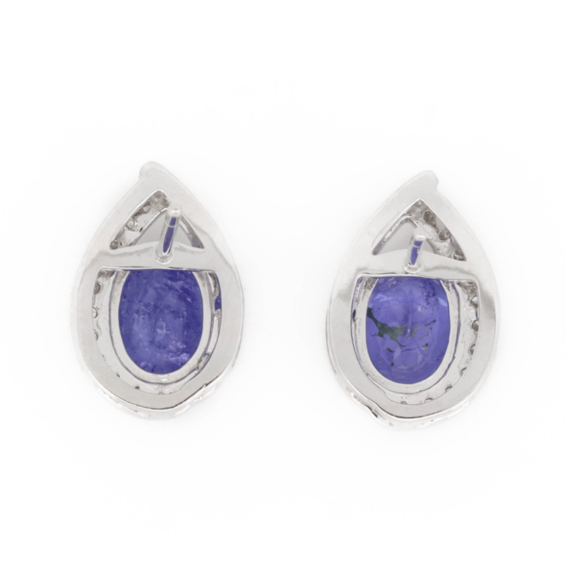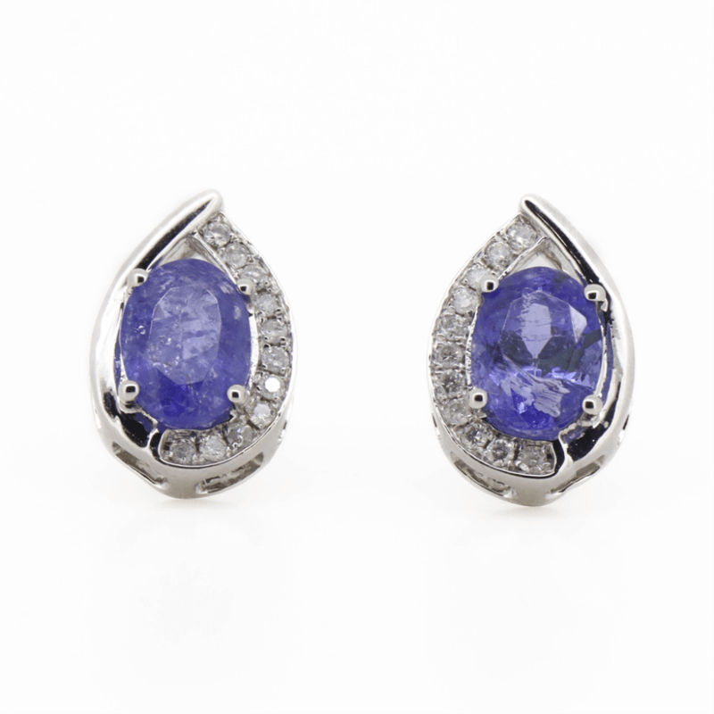 14K WHITE GOLD, TANZANITE AND DIAMOND, STUD EARRINGS. THE CENTRES FEATURE, 2 OVAL CUT, MEDIUM LIGHT PURPLISH-BLUE, TANZANITES (2.39CT TSW, EYE VISIBLE INCLUSIONS), 4 CLAW SET. DECORATING THE CENTRES ARE, 22 ROUND BRILLIANT CUT, DIAMONDS (0.20CT TDW, H-J COLOUR, SI2-I1 CLARITY), BEAD SET. THE EARRINGS HAVE POST BACKS, WITH 14K WHITE GOLD BUTTERFLY CLAPS.