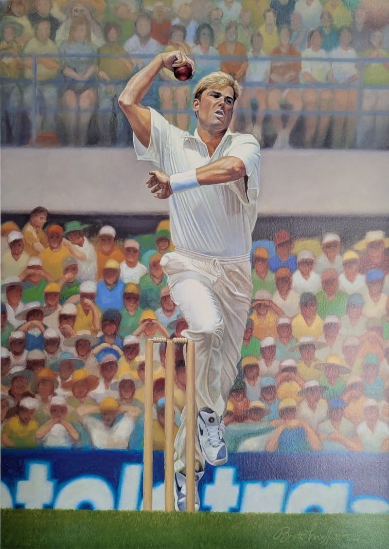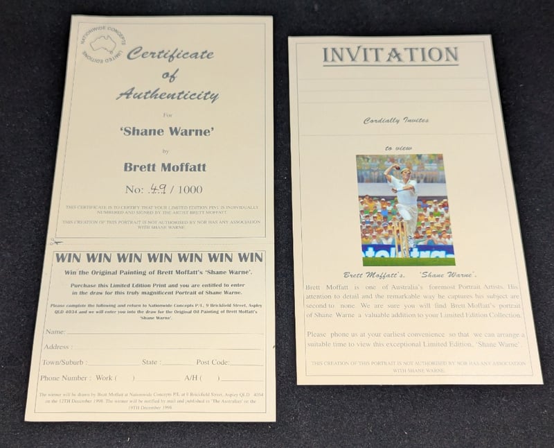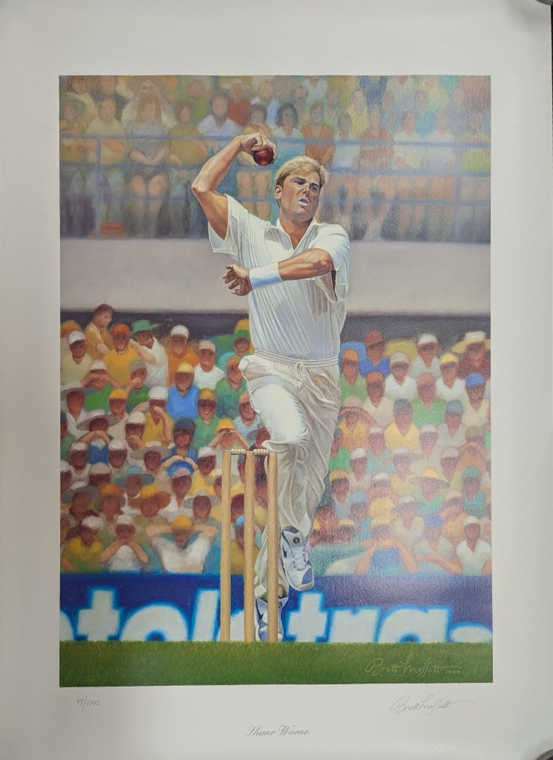 Shane Warne Lithograph On Paper, Signed Lower Right By Artist Brett Moffatt, 49/1000, Includes Certificate Of Authenticity