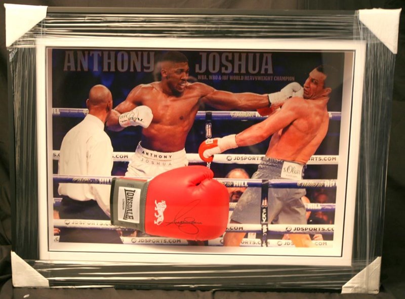 Anthony Joshua Signed Glove Framed A Supurb Hand Signed Full Size Glove By British Heavyweight And World Champion Anthony Joshua. Includes Photo Proof From The Commerical Signing The Glove Is Beautifully Presented In A Custom Displayed 3D Box Frame With Image To Background. Includes Certificate And Photo Proof.