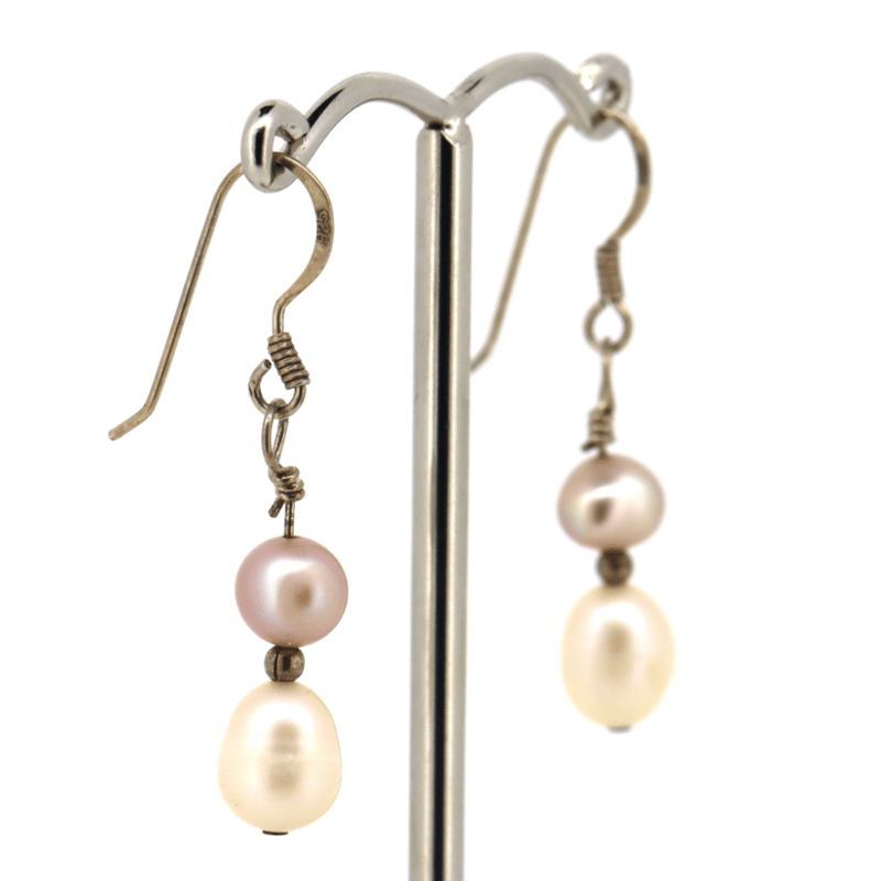 STERLING SILVER AND PINK AND WHITE PEARL, DROP EARRINGS.