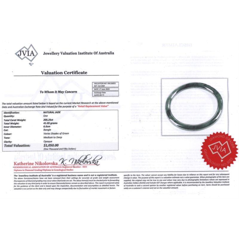NATURAL JADE BANGLE Varies Of Shades Of Greens, Jade (205.25Ct, Opaque). Inner Diameter Is 6.00Cm. Total Weight Is 41.03 Grams. Jewellery Valuations Provided By A Third Party Professional Not Directly Associated With Lloyds Auctions at AUD $1,050.00This Insurance Valuation has been provided by a registered Jewellery Valuer and is intended for insurance purposes only. The valuation amount has no bearing on the auction value of the item. Any questions regarding the valuation should be directed to the issuing Valuer (refer to contact details on the certificate) as Lloyds have no association or relationship with the Valuer or the valuation amount contained within the valuation. Condition: NEW 0645868+1355