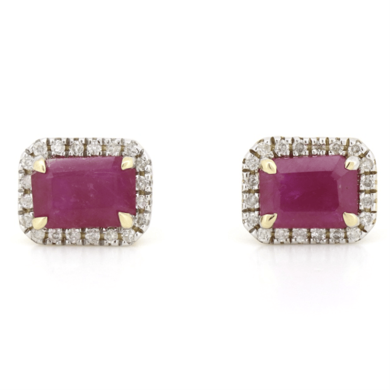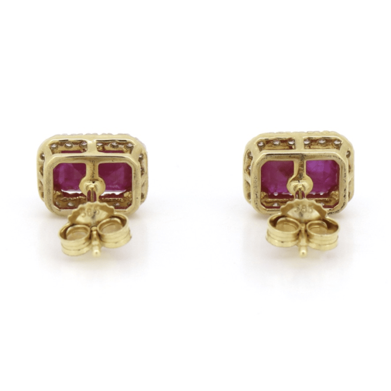 The Centres Feature, 2 Emerald Cut, Pinkish-Red, Rubies (1.71Ct Tsw, Included, Enhanced), 4 Claw Set. Surrounding The Centres In Halos Are, 40 Round Brilliant Cut, Diamonds (0.17Ct Tdw, I-K Colour, P1-P2 Clarity), Claw Set. The Earrings Have Post Backs, With 14K Yellow Gold Butterfly Clasps.