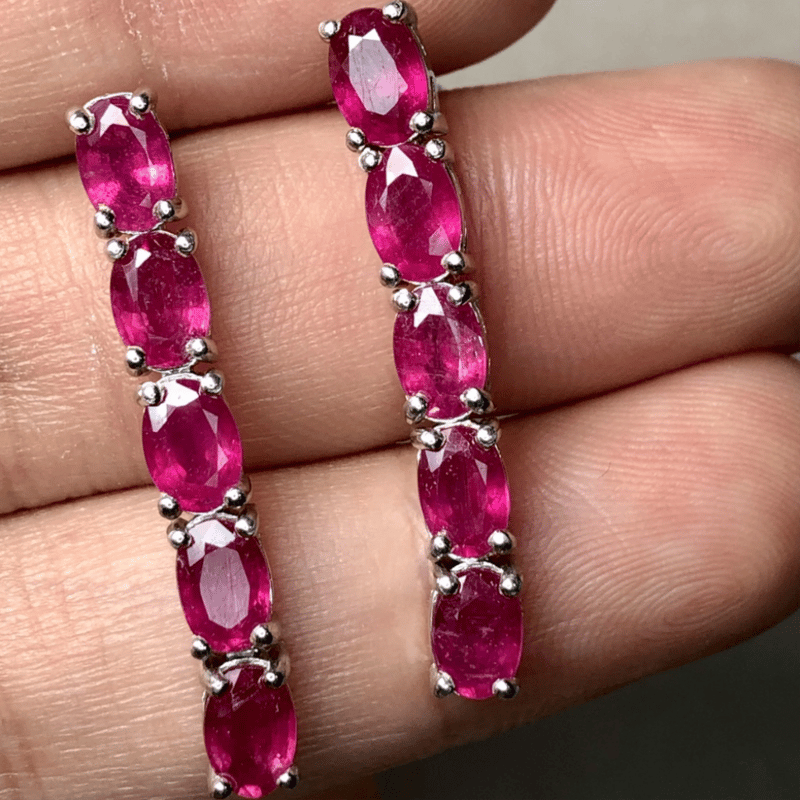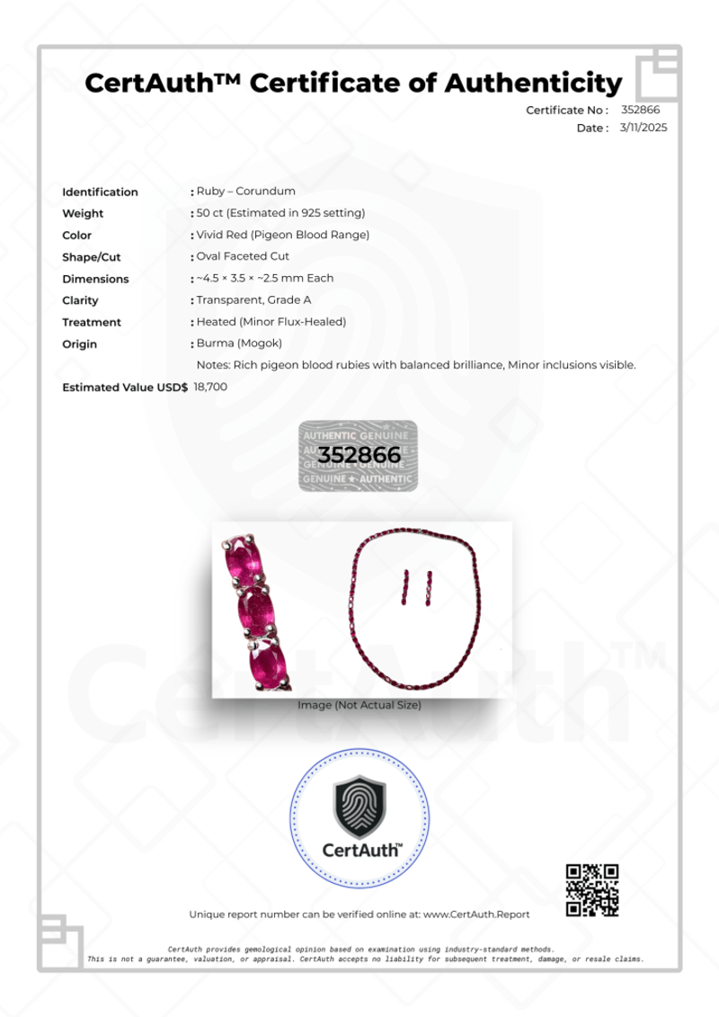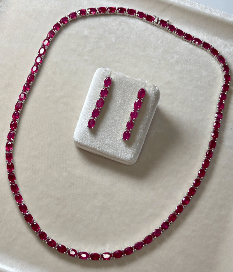 A Magnificent Fine Jewellery Set Featuring Vivid Pigeon Blood Red Rubies From Mogok, Burma — The World’S Most Sought-After Ruby Origin. The Necklace And Matching Earrings Display Remarkable Colour Intensity And Uniform Brilliance Across An Estimated 50 Carats Of Natural Corundum, Securely Set In 925 Sterling Silver.