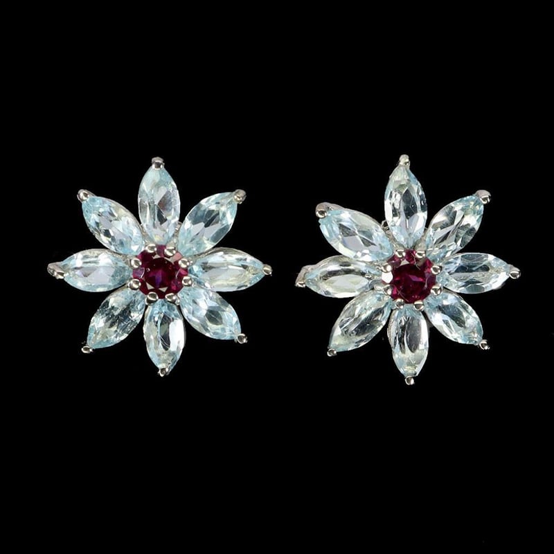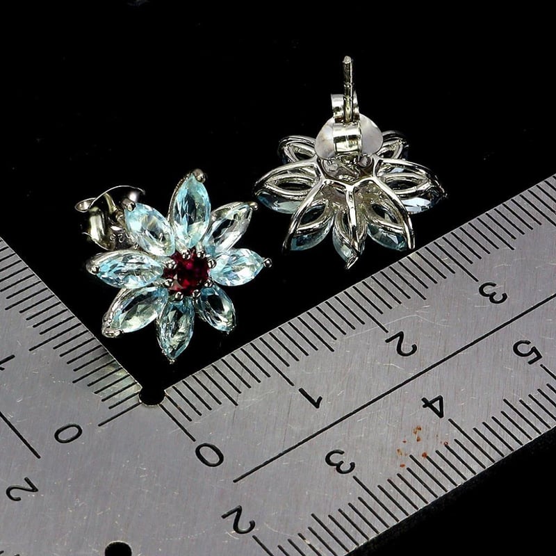 NATURAL SKY BLUE TOPAZ & GARNET EARRINGS. Natural Sky Blue Topaz & Garnet Earrings. Made In Solid Sterling Silver And Plated In14K White Gold. Features Natural Sky Blue Topaz And Natural Rhodolite Garnets. Earrings Measure 17.0 X 17.0 Mm. Condition: Good - Refer Images 0488360+5