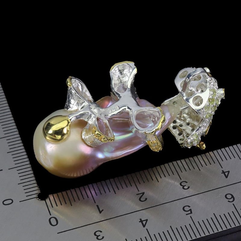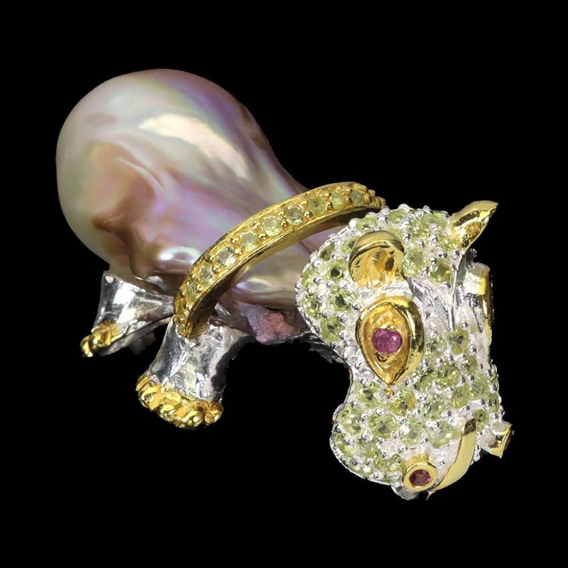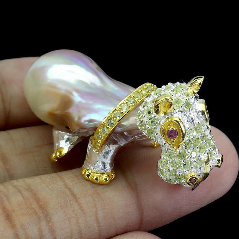 Natural Pearl & Peridot Hippo Pendant. Made In Solid Sterling Silver And Plated In14K White And Yellow Gold. Features Natural Baroque Pearl, Natural Peridot And Natural Rhodolite Garnets As Eyes. Pendant Measures 45.0 X 21.0 Mm.