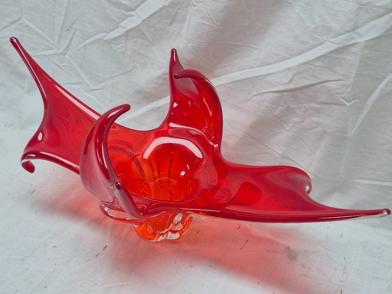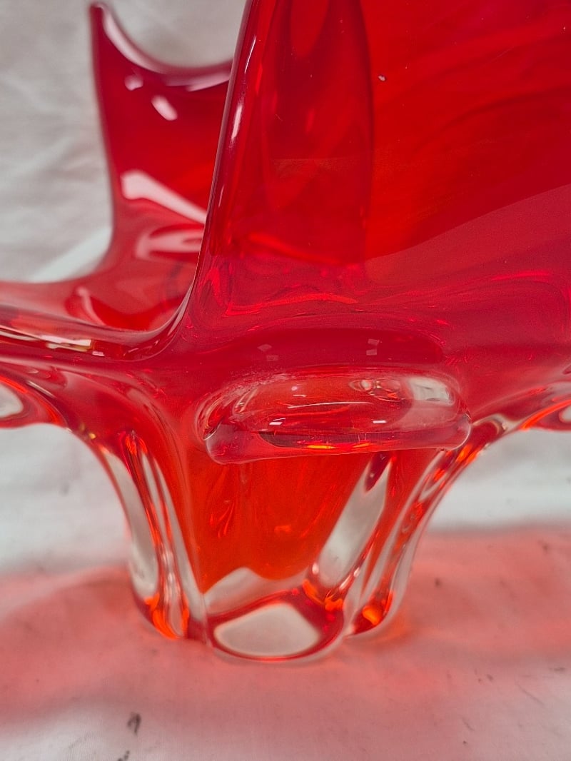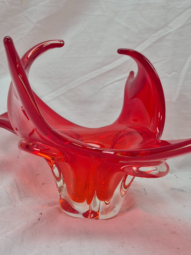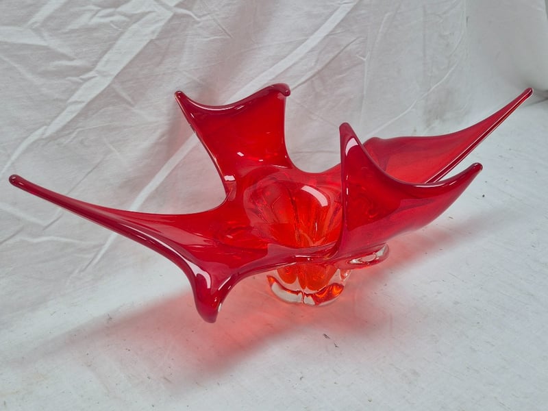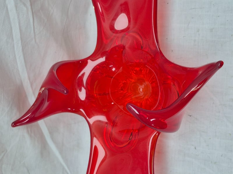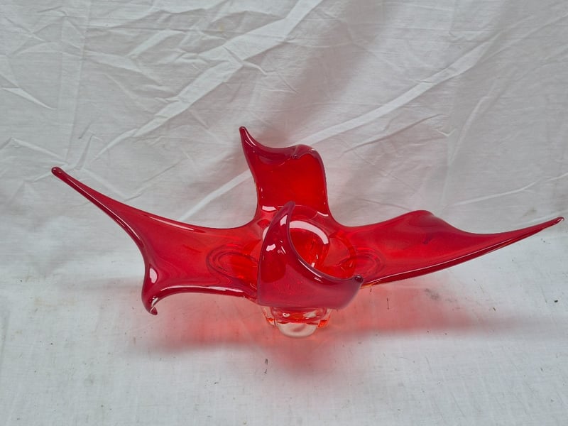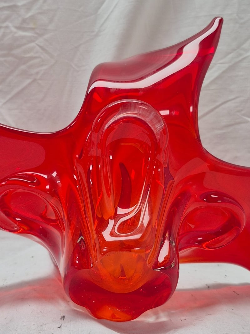 RED ART GLASS SCULPTURAL VESSEL WITH EXTENDED ORGANIC TENDRILS Item Size: Height: 20cm, Width: 52.5cm, Depth: 3cm, Weight: 6Kg Striking Contemporary Art Glass Sculpture In Deep Crimson Red, Featuring An Organically Shaped Central Vessel With Four Gracefully Extended, Curved Tendrils Reminiscent Of Tentacles Or Plant-Like Appendages. Condition: Good - Refer To Images 7A 586273+1
