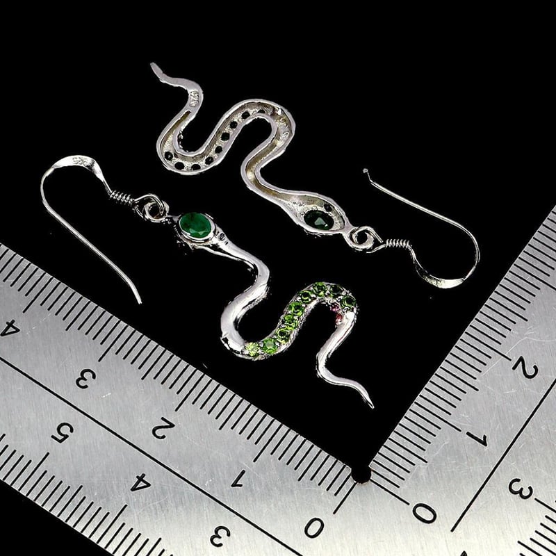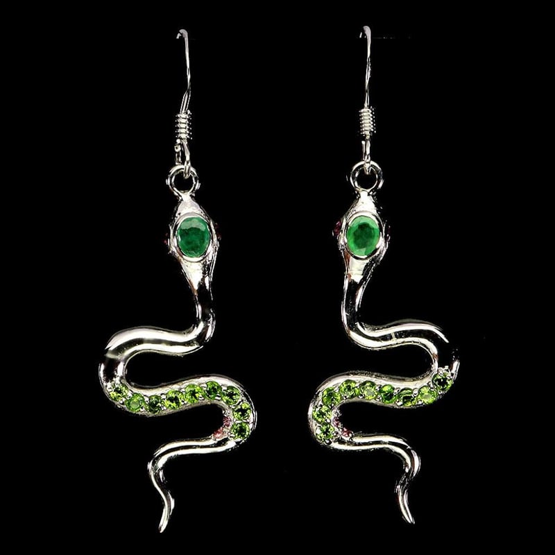 Natural Emerald Serpent Earrings. Made In Solids Sterling Silver And Plated In14K White Gold. Features All Natural Emeralds, Chrome Diopside And Garnets. Earrings Measure 47X14Mm