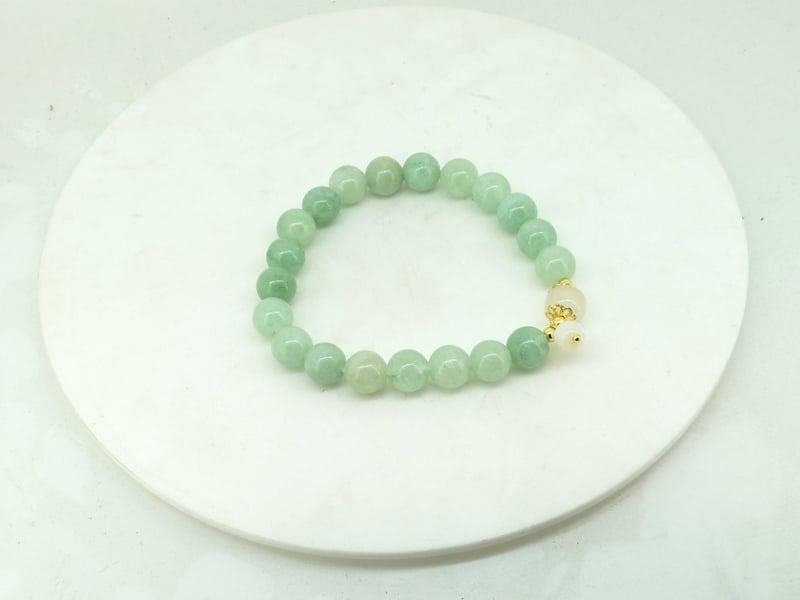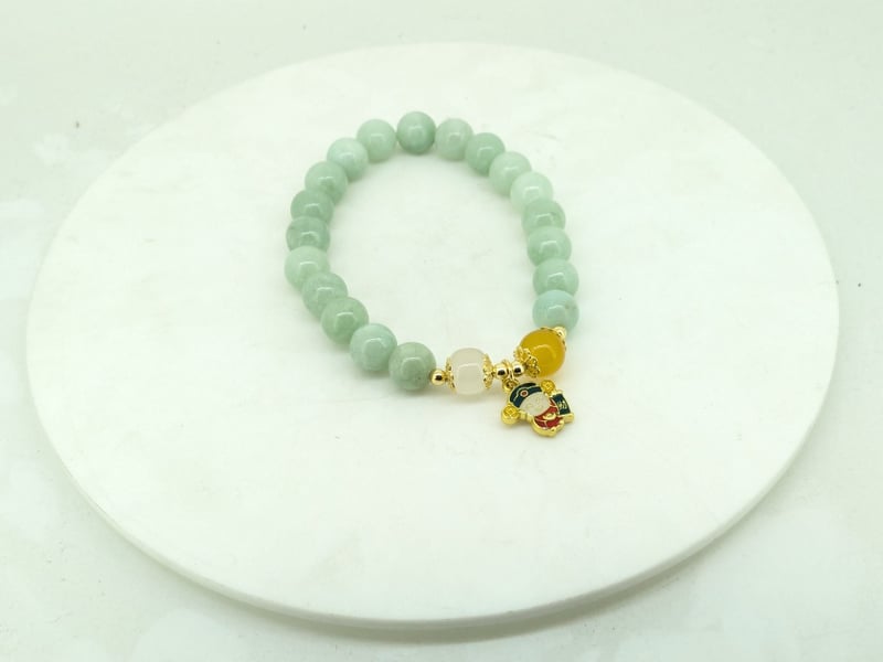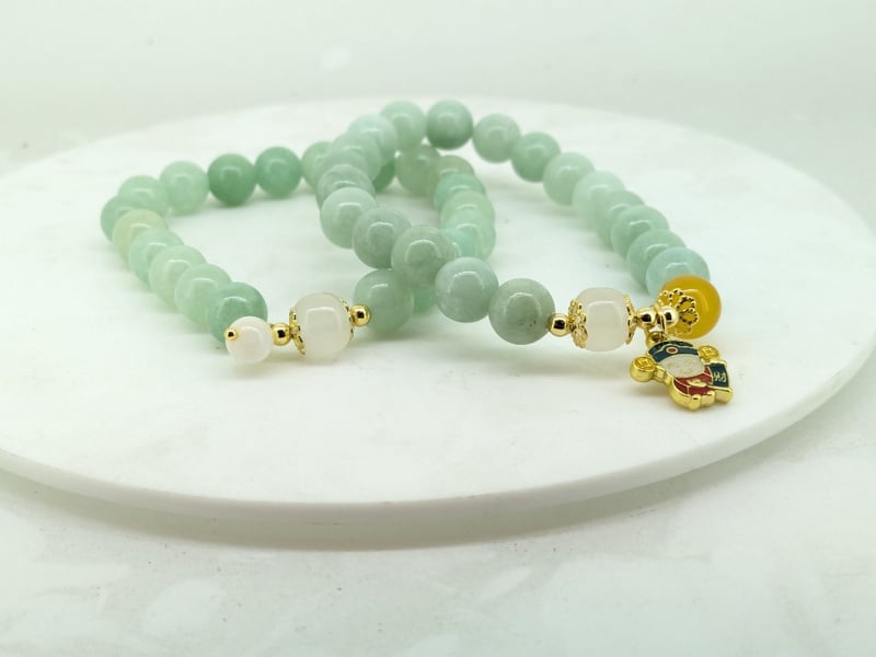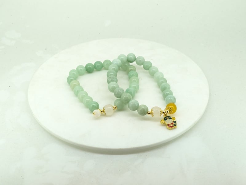 TWO JADE COLOURED BEADED BRACELETS WITH CHARMS