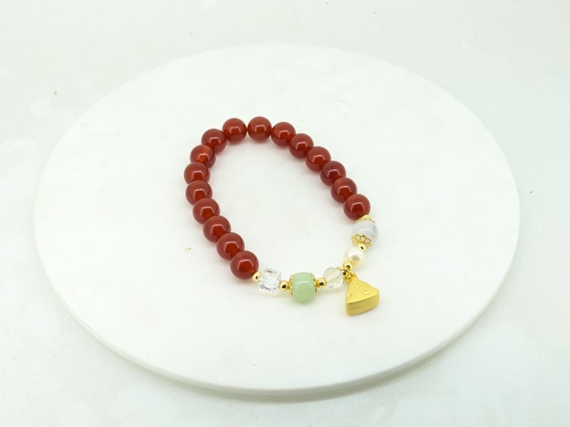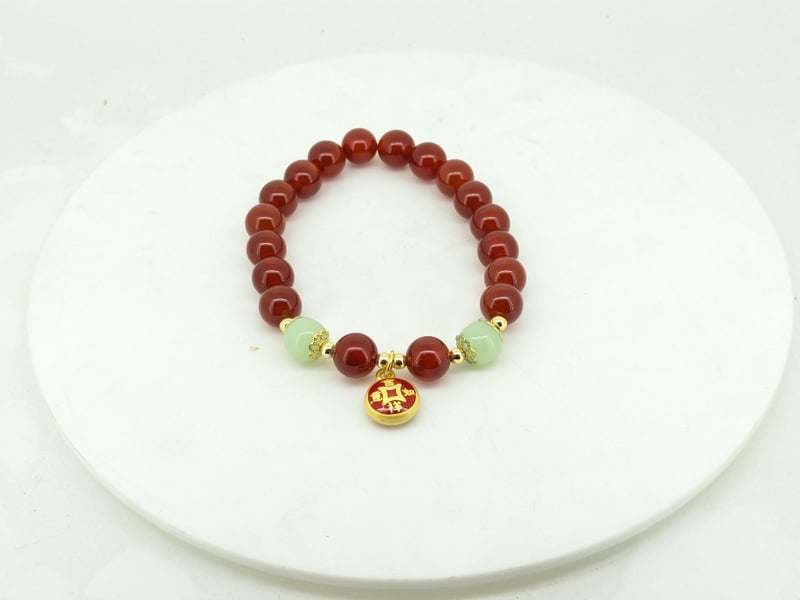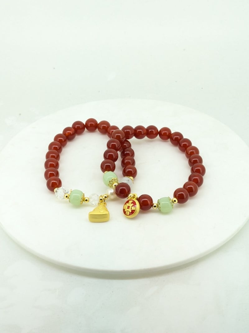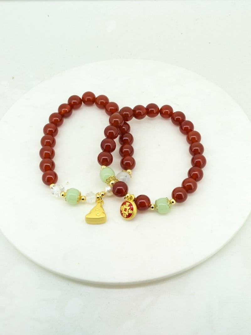 TWO AMBER COLOURED BEADED BRACELETS WITH CHARMS
