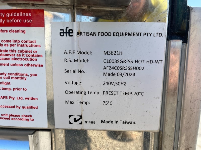 “Le Chef ” Square Glass Display Cabinet – Heated – Stainless Steel – 6 Shelves Make: Artisian Model: M3621H Year: 03/2024 R.S Model: C1003SGR-SS-HOT-HD-WT Serial #: AF240COSR3SSH002 Voltage: 240V,50HZ Max Temp: 75 Degrees Operating Temp: PRESET TEMP 70 DEGREES Sold as is, Location: 3/263 Connors road, Paget, Mackay, 4070 Contact: Bradley Taylor - 0473425094 - [email protected]