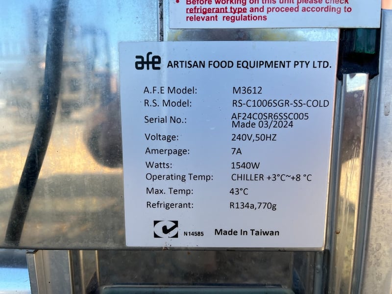 “Le Chef ” Square Glass Display Cabinet – Refrigerated – Stainless Steel – 6 Shelves Make: Artisian Model: M3612 Year: 03/2024 R.S Model: RS-C1006SGR-SS-COLD Serial #: AF24C0SR6SSC005 Voltage: 240V,50HZ Amerpage: 7A Watts: 1540W Operating Temp: CHILLER +3 degrees Max Temp: 43 Degrees Sold as is, Location: 3/263 Connors road, Paget, Mackay, 4070 Contact: Bradley Taylor - 0473425094 - [email protected]