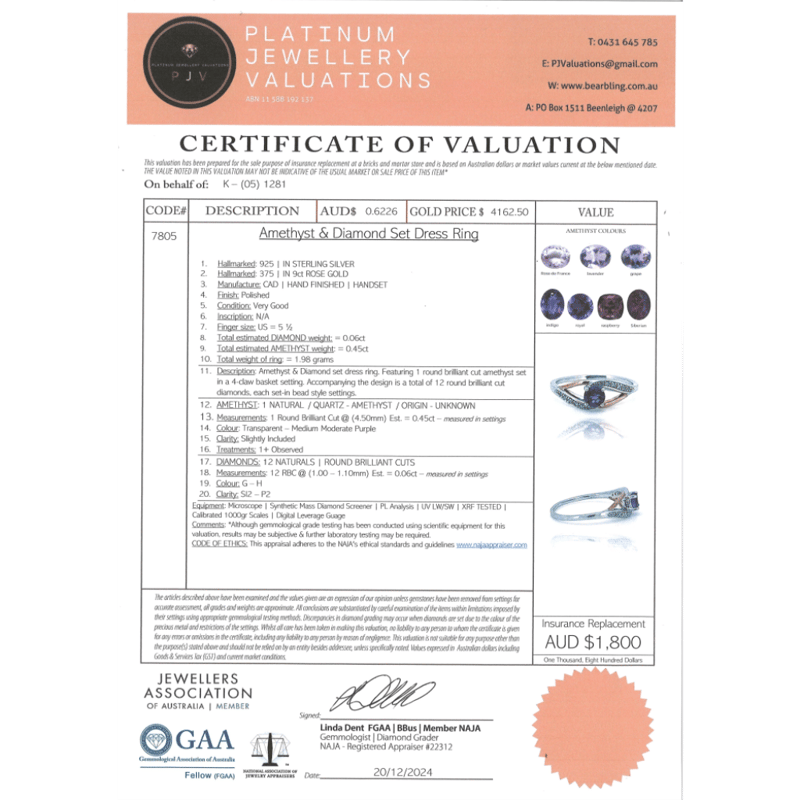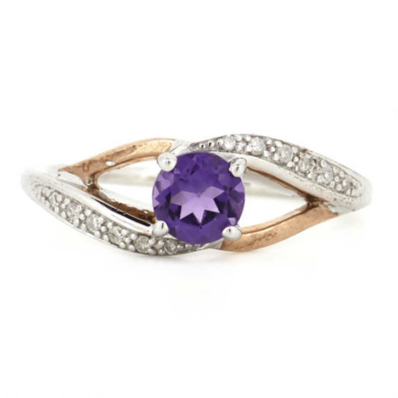 9K ROSE GOLD/STERLING SILVER, AMETHYST AND DIAMOND, DRESS RING.