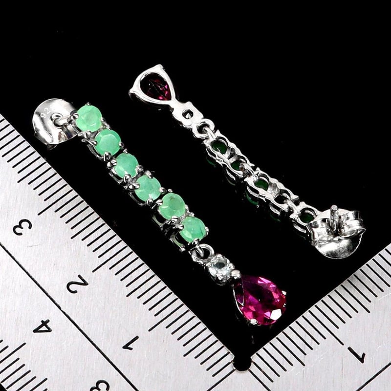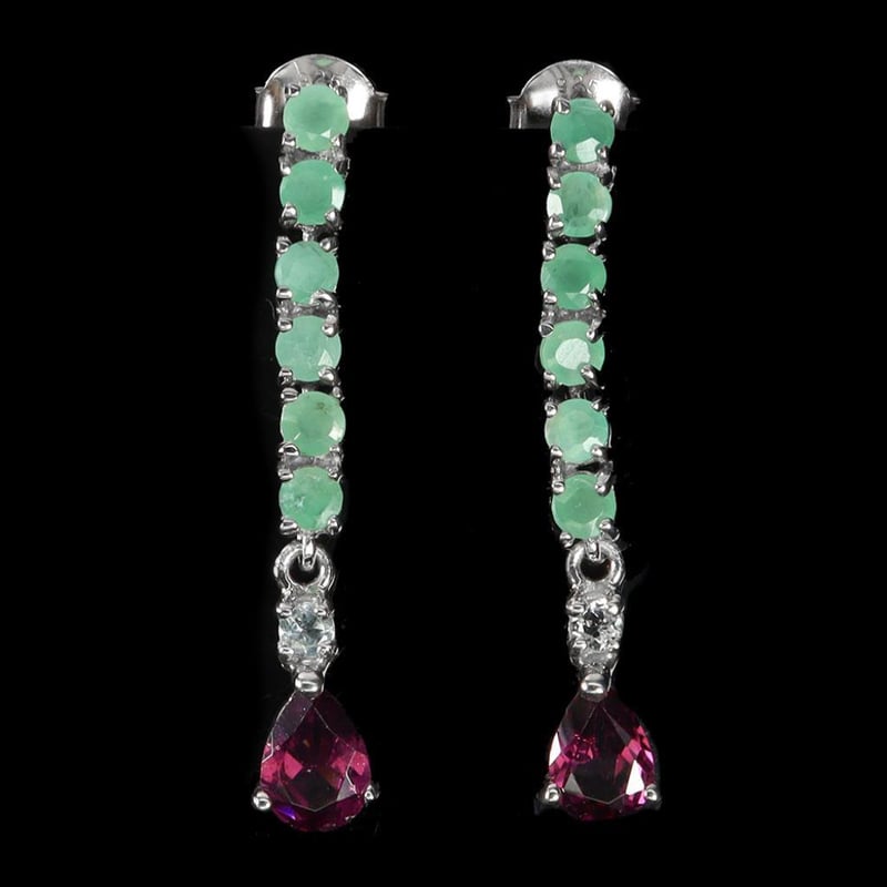 Natural Emerald & Garnet Earrings. Made In Solid Sterling Silver And Plated In14K White Gold. Features Natural Green Emeralds And Natural Rhodolite Garnets. Earrings Measure 32.0 X 5.0 Mm.